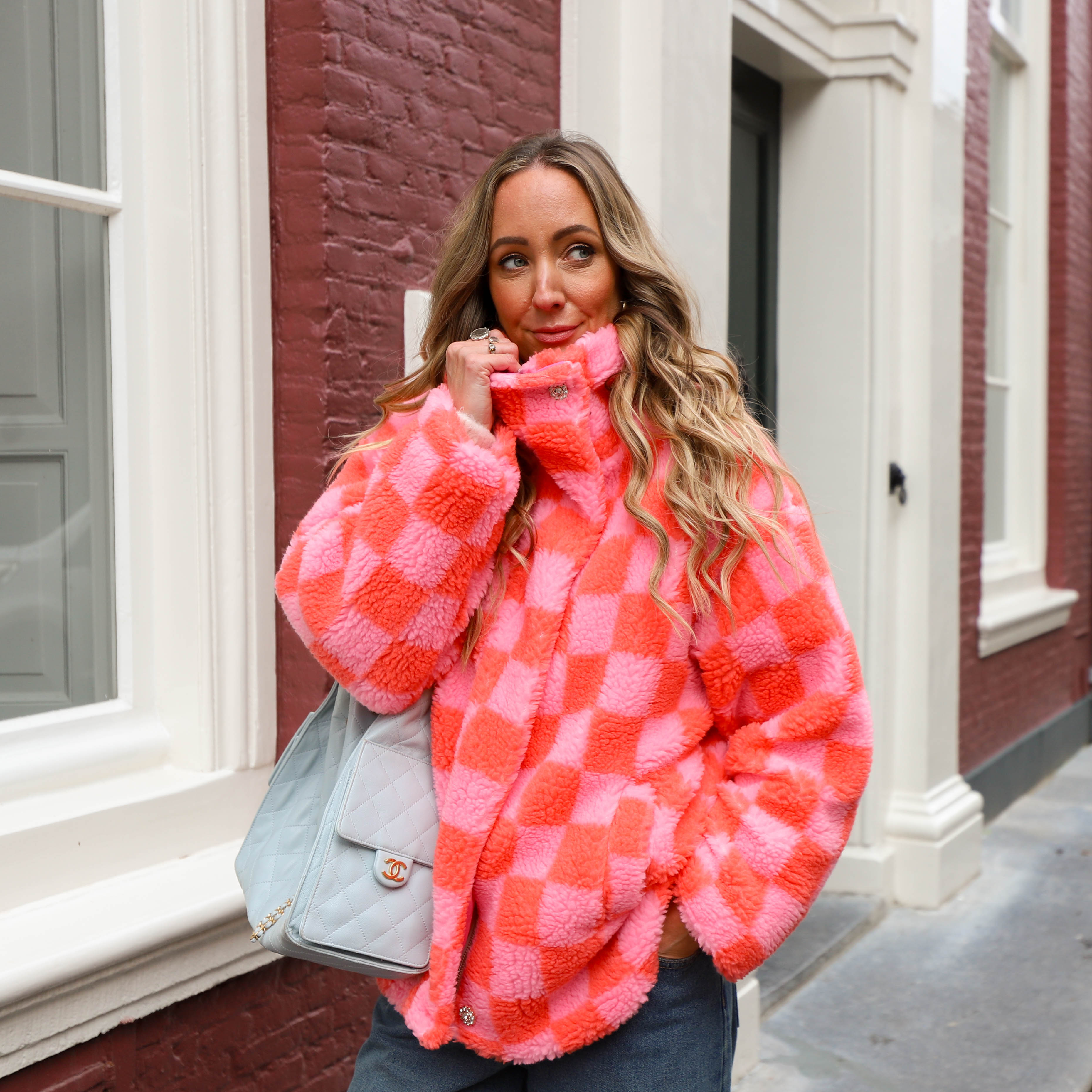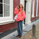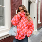 Dit Checked Teddy Jack is een opvallende en speelse toevoeging aan je outerwear collectie. Het jack is gemaakt van een heerlijk zachte, krullende teddy-stof en heeft een gedurfd blokjespatroon in roze en oranje. Het jack heeft een ruime, oversized pasvorm, een hoge kraag en een ritssluiting.