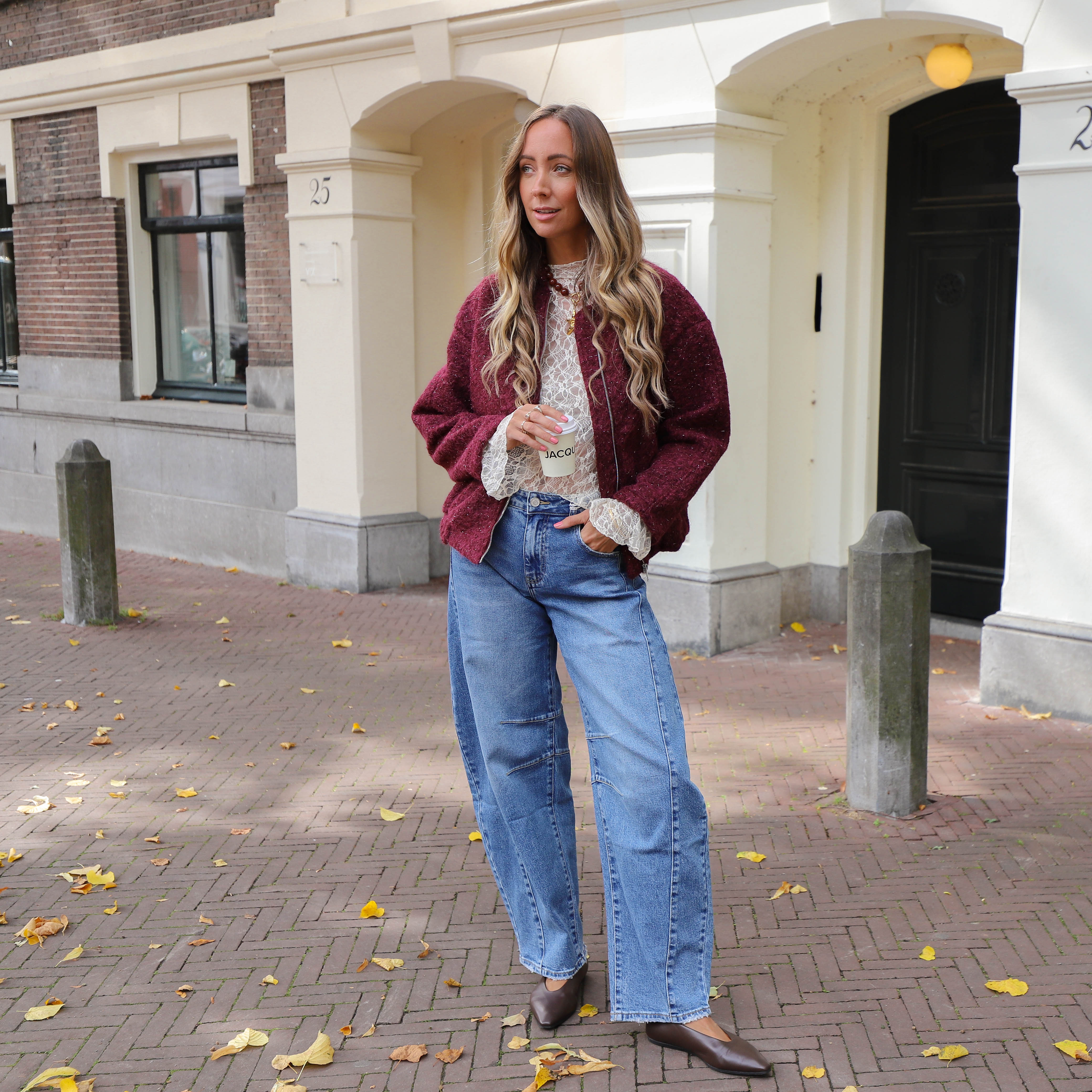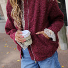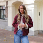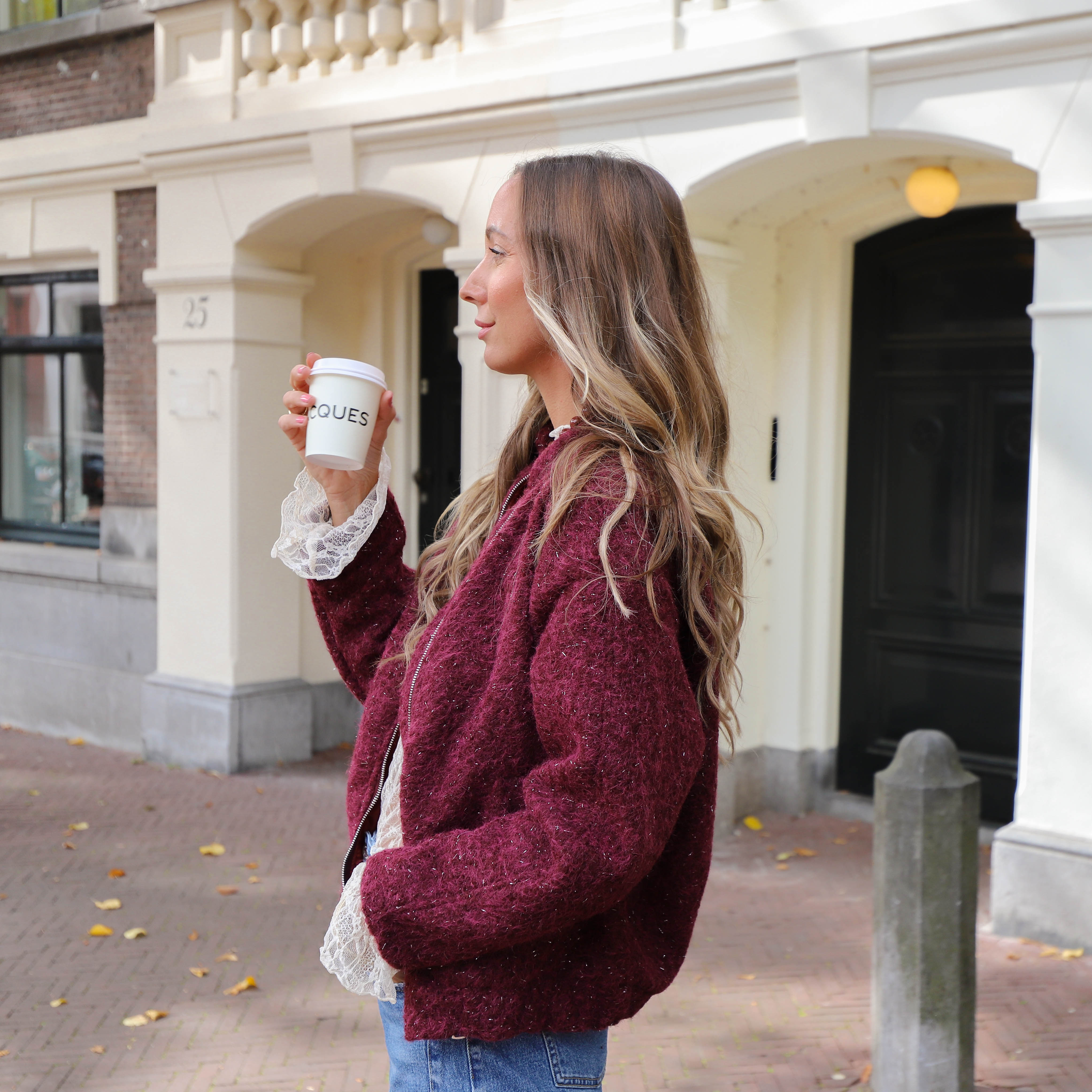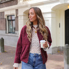 Geef je outfit een comfortabele en stoere twist met dit leuke teddy jasje in een trendy bordeauxrode kleur. Het jasje heeft een oversized pasvorm met een opvallende textuur en glinsterende details. Het jasje heeft een ronde halslijn en een ritssluiting aan de voorkant. Aan de zijkant zijn er opgestikte zakken die het jasje zowel stijlvol als praktisch maken.