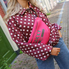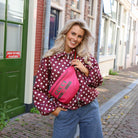 Dit opvallende, bordeauxrode jack met witte stippen is de perfecte statement piece. Het jack heeft een kraag, twee steekzakken en sluit met een zilverkleurige rits. De elastische boorden aan de mouwen en onderkant zorgen voor een sportieve en comfortabele pasvorm. Gemaakt van een zachte en soepele stof, is dit jack ideaal voor een trendy en casual look.