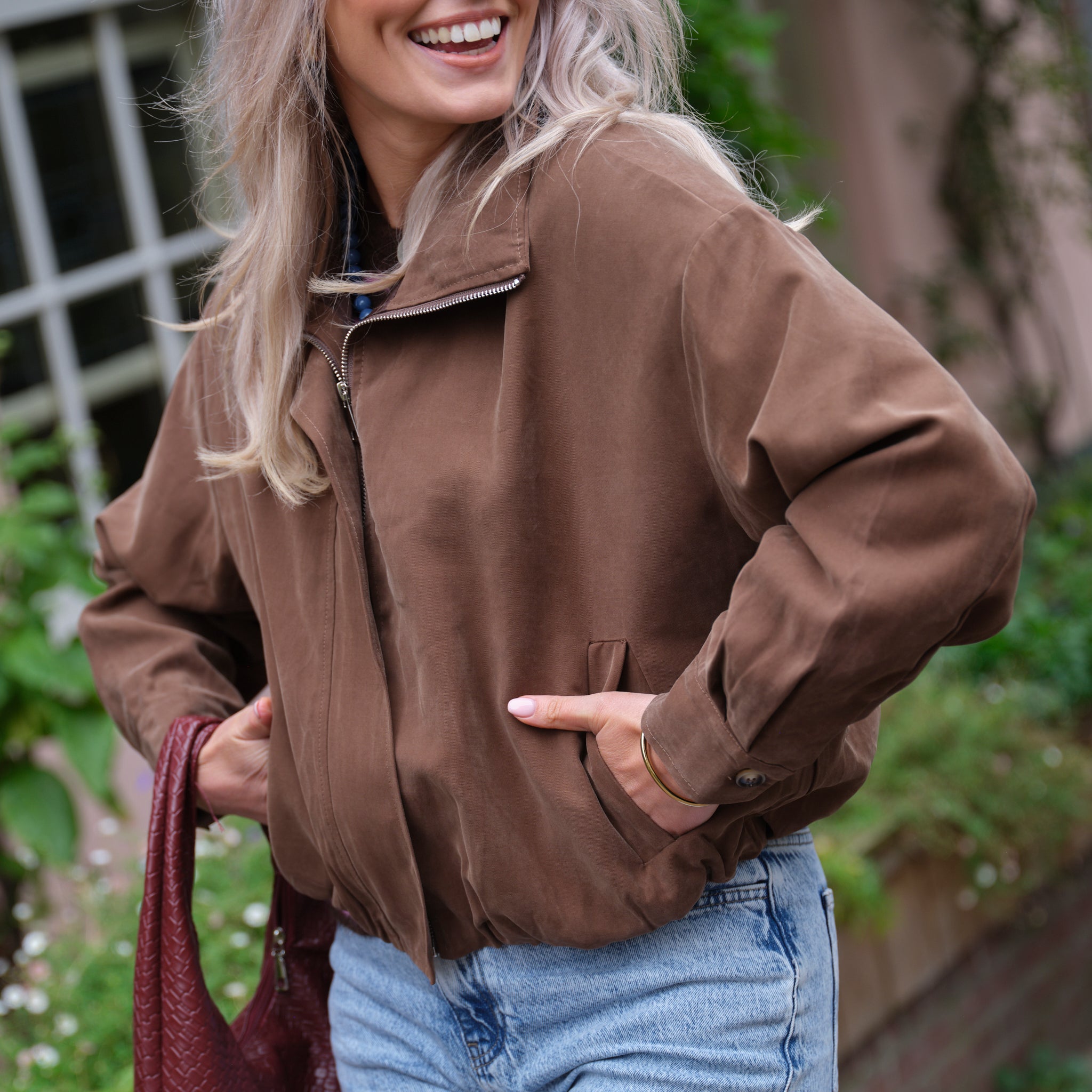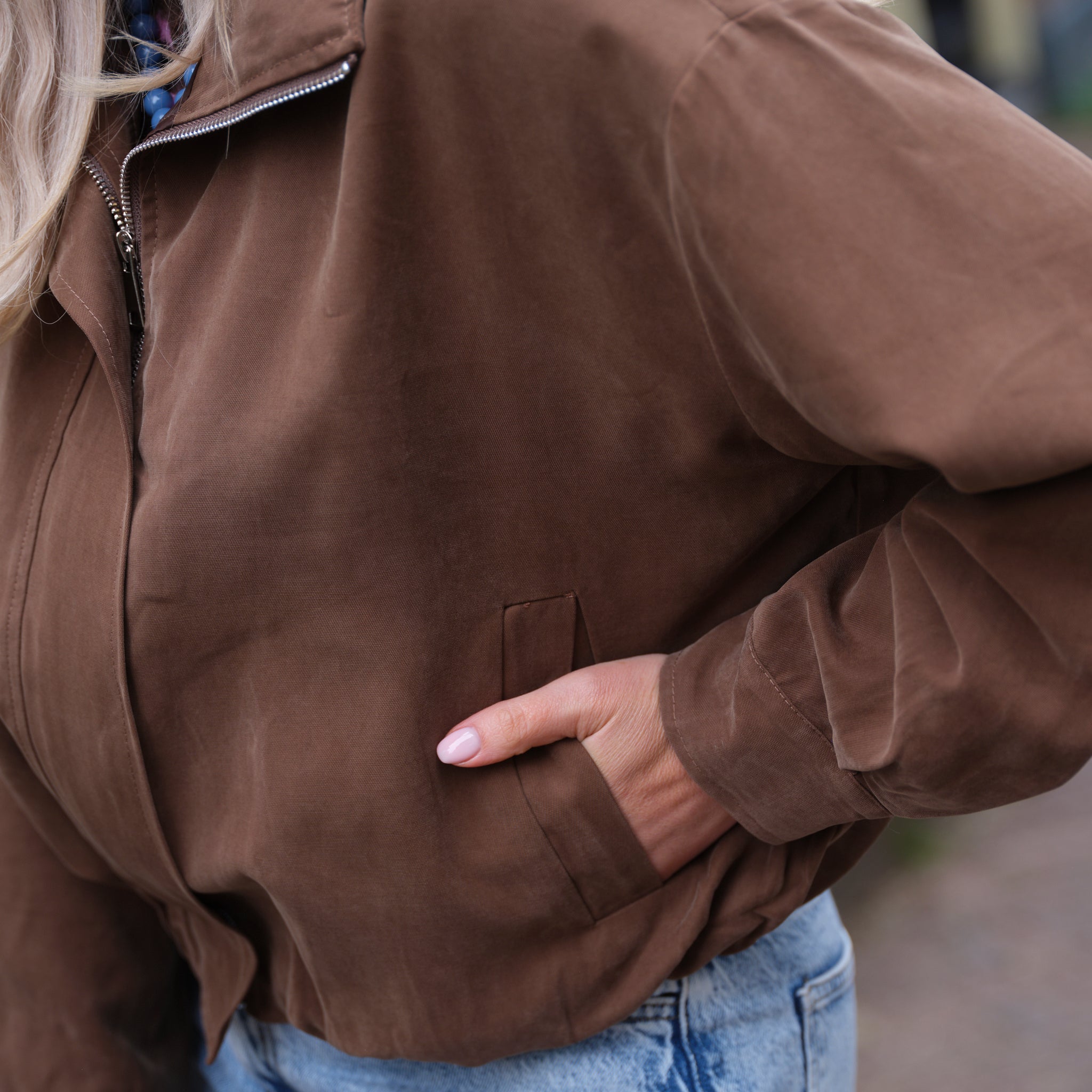 Dit Fien Fall Jack Choco is de perfecte tussenjas voor een edgy, maar verfijnde look. Het jasje heeft de uitstraling van suède in een warme, tijdloze chocoladebruine kleur. De schuine ritssluiting en de klassieke reverskraag geven het jack de stoere uitstraling van een bikerjack. Dit jack voelt heerlijk zacht aan en is de ideale aanvulling op elke outfit – combineer het met een spijkerbroek voor een casual look, of over een jurk voor een biker-chic contrast.