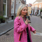 Mooie lange jas in een paars roze kleur. De jas heeft twee zakken aan de voorkant en sluit met knopen. Fleurt elke outfit op!
