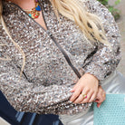 Mooi grijs bomber jack met pailletten. Het jasje heeft twee zakken aan de voorkant en sluit met rits. Fleurt elke outfit op!