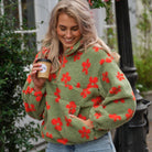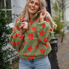 Deze heerlijk zachte en speelse Teddy Fleece Trui is de perfecte trui om je warm en vrolijk te houden. De trui is gemaakt van een zachte, groene teddy fleece stof en is voorzien van een opvallend, all-over patroon van rode bloemen. De hoge kraag met korte ritssluiting, de comfortabele buidelzak aan de voorkant en de elastische boord aan de onderkant geven deze trui een casual en behaaglijke look.