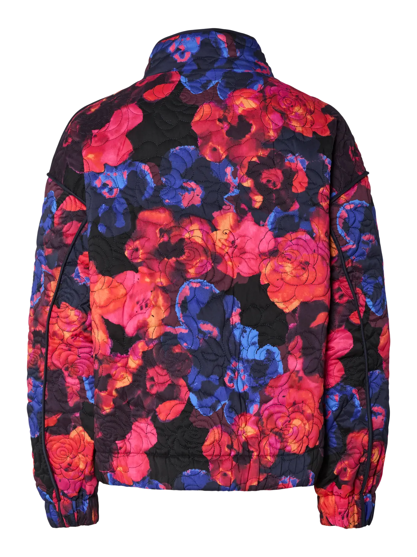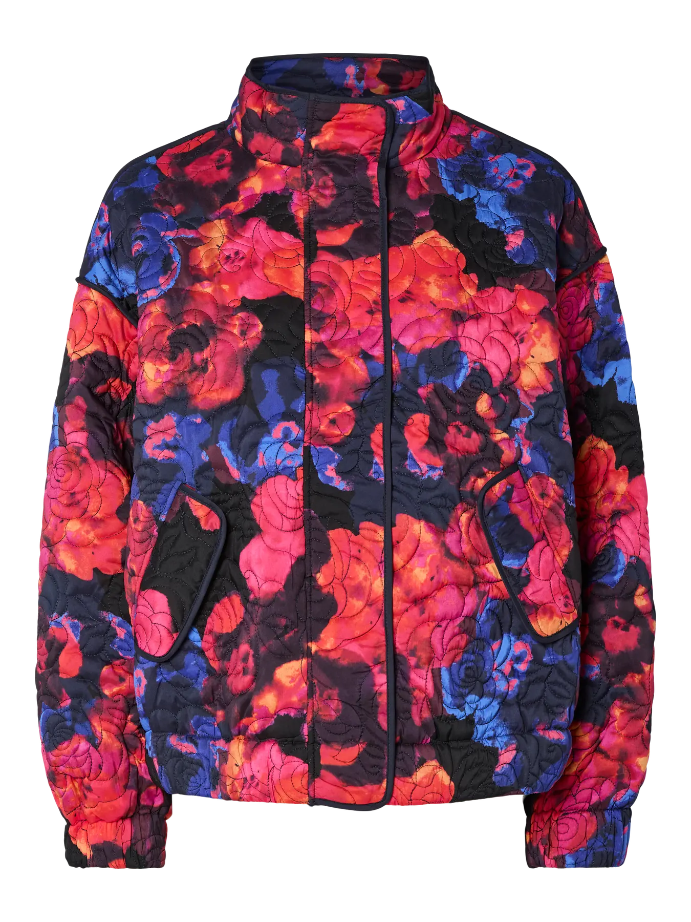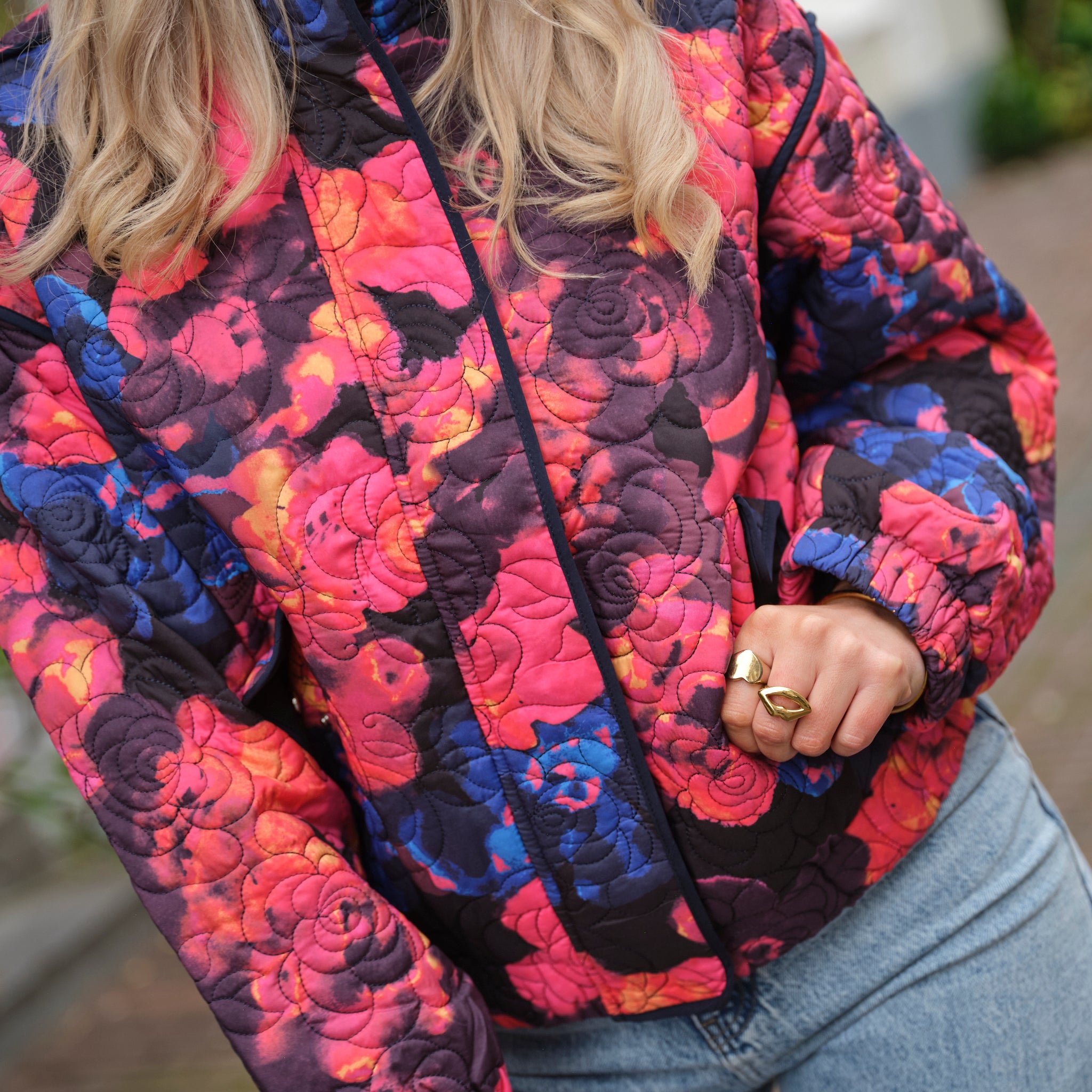 Dit YAS Fipura Quilted Jacket is een ware eyecatcher die functionaliteit met een gedurfd design combineert. Het jack is uitgevoerd in een opvallende donkerblauwe (navy) basis met een levendige bloemenprint in warme tinten als rood, oranje en elektrisch blauw. Het geheel is verrijkt met een fijn quiltpatroon in de vorm van rozen, wat zorgt voor textuur en extra warmte. De opstaande kraag en de comfortabele cropped pasvorm maken dit jack een trendy statement piece.