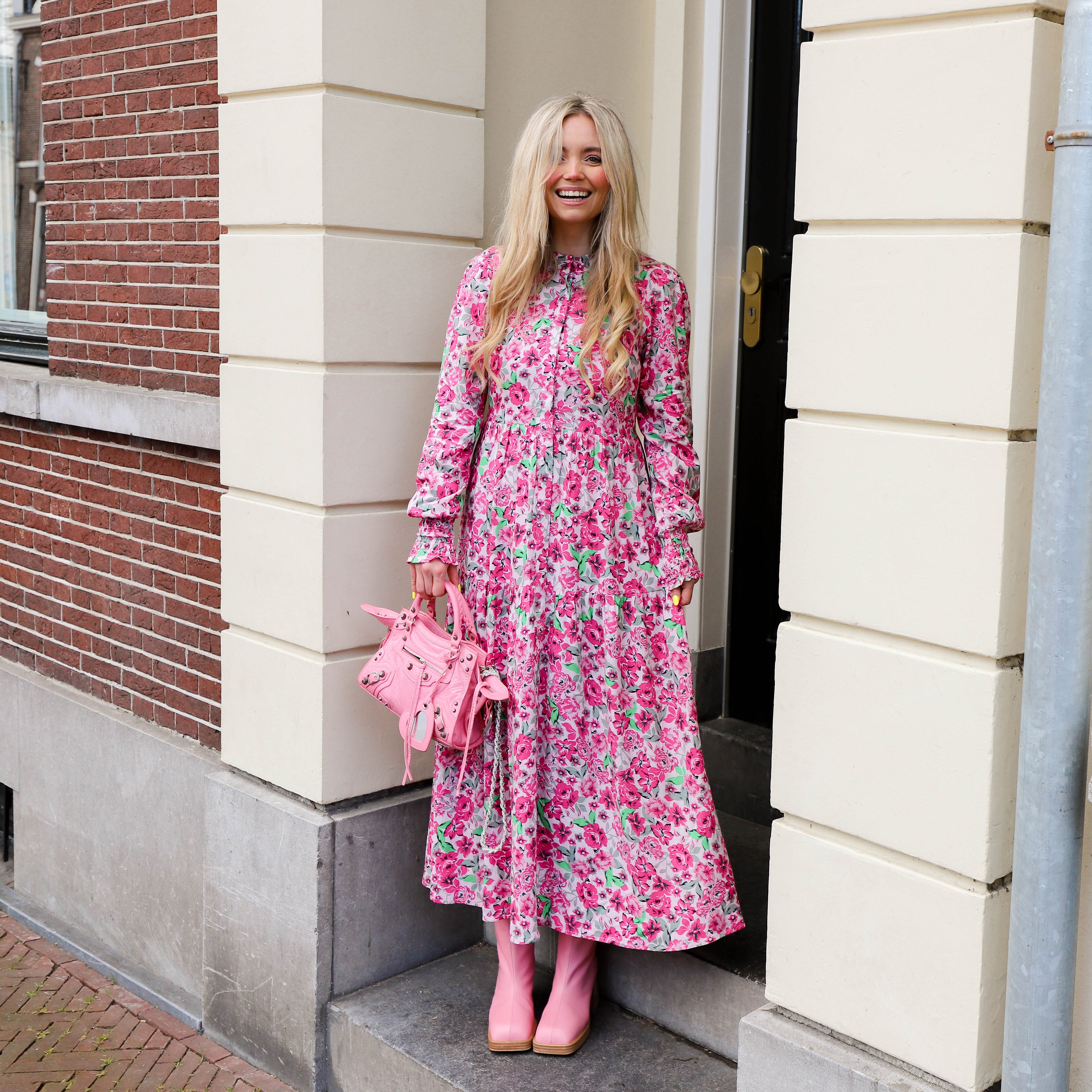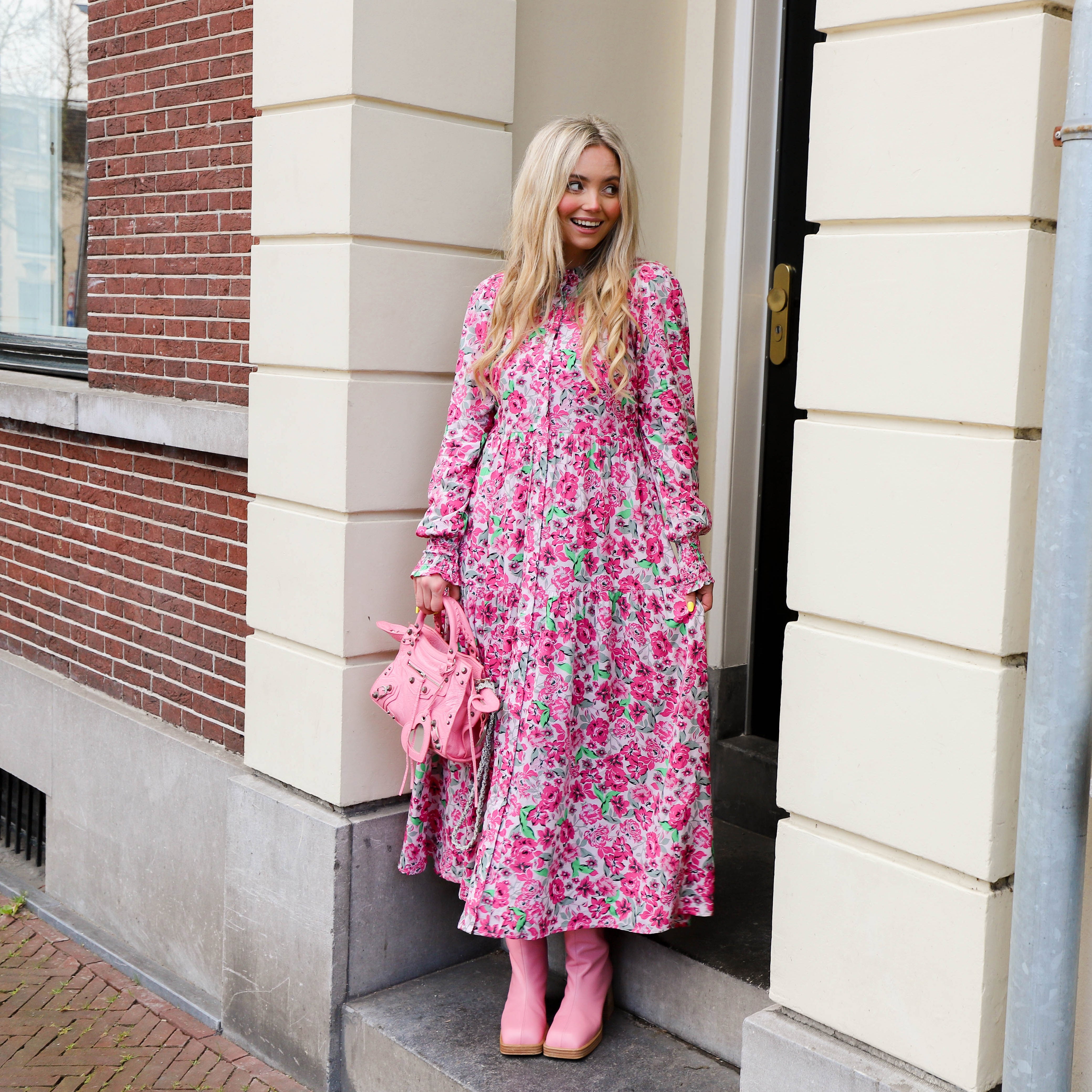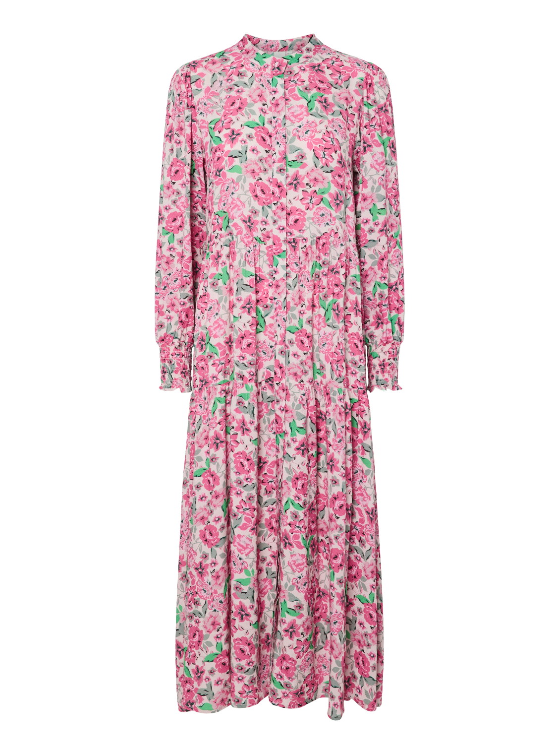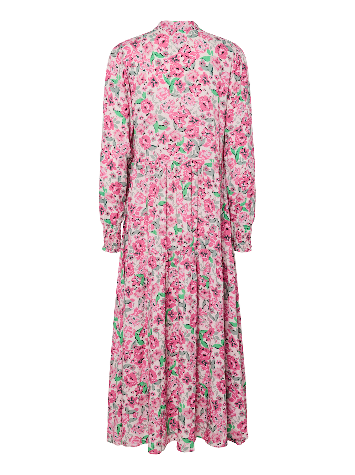 Mooie maxi dress met kleurrijke print. De jurk sluit met knopen en zit heerlijk. De smockdetails aan de mouwen maken de jurk af. Staat goed met een vrolijke tas en een paar laarsjes.