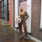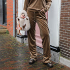 Mooie beige velourse broek met gouddraad. De broek heeft een hoge taille en is te strikken, waardoor hij altijd mooi aangesloten zit. Combineer met de bijpassende top en een blazer om je look af te maken.