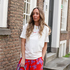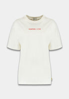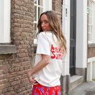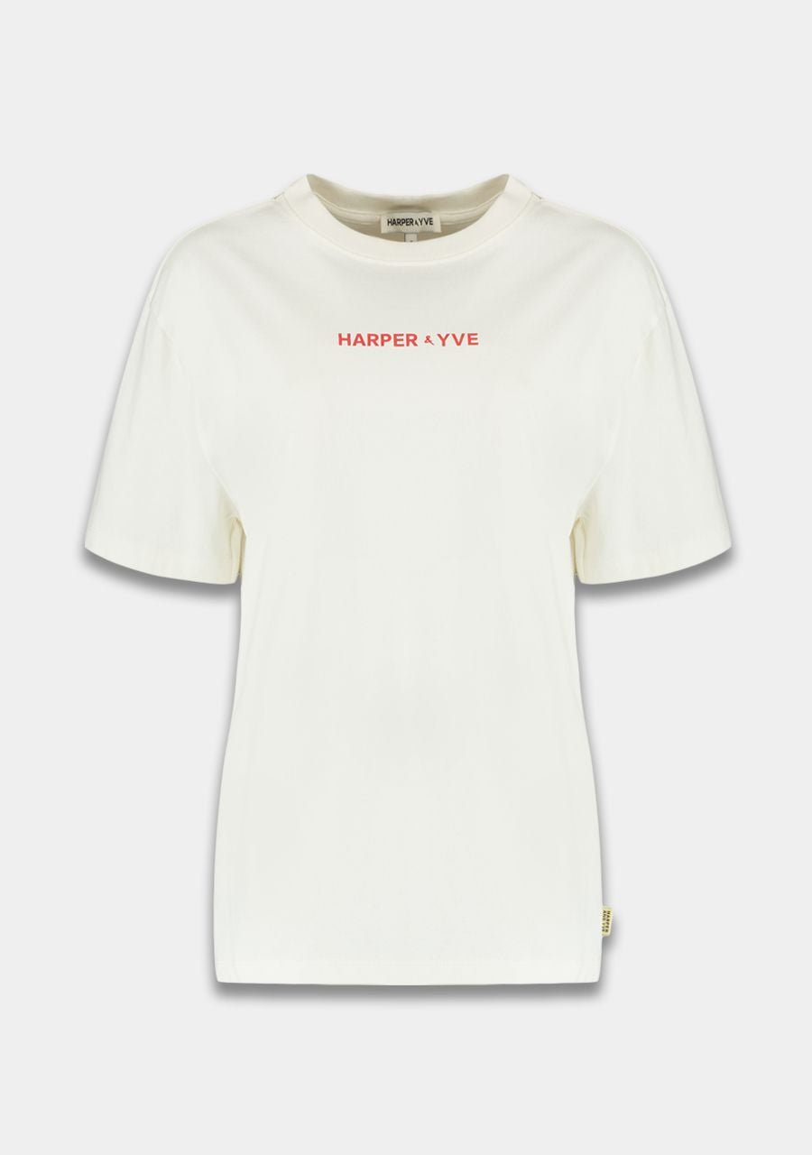 Dit ecru T-shirt van Harper & Yve is de perfecte basis met een verrassende twist! Op de voorkant vind je het logo in een subtiele rode print, maar de echte eyecatcher zit op de rug. Het shirt heeft een fijne, relaxte pasvorm en is gemaakt van een heerlijk zachte stof die de hele dag comfortabel zit.