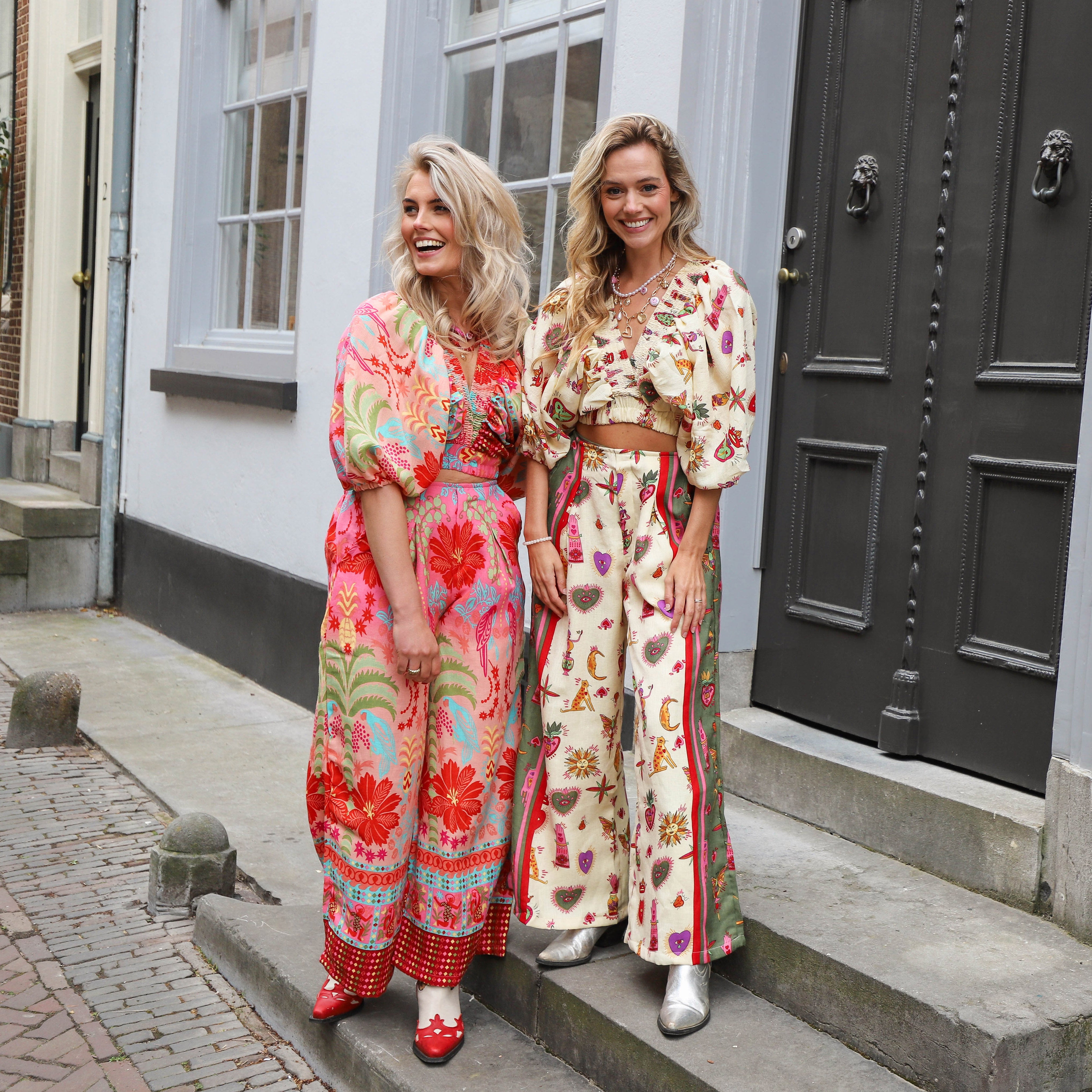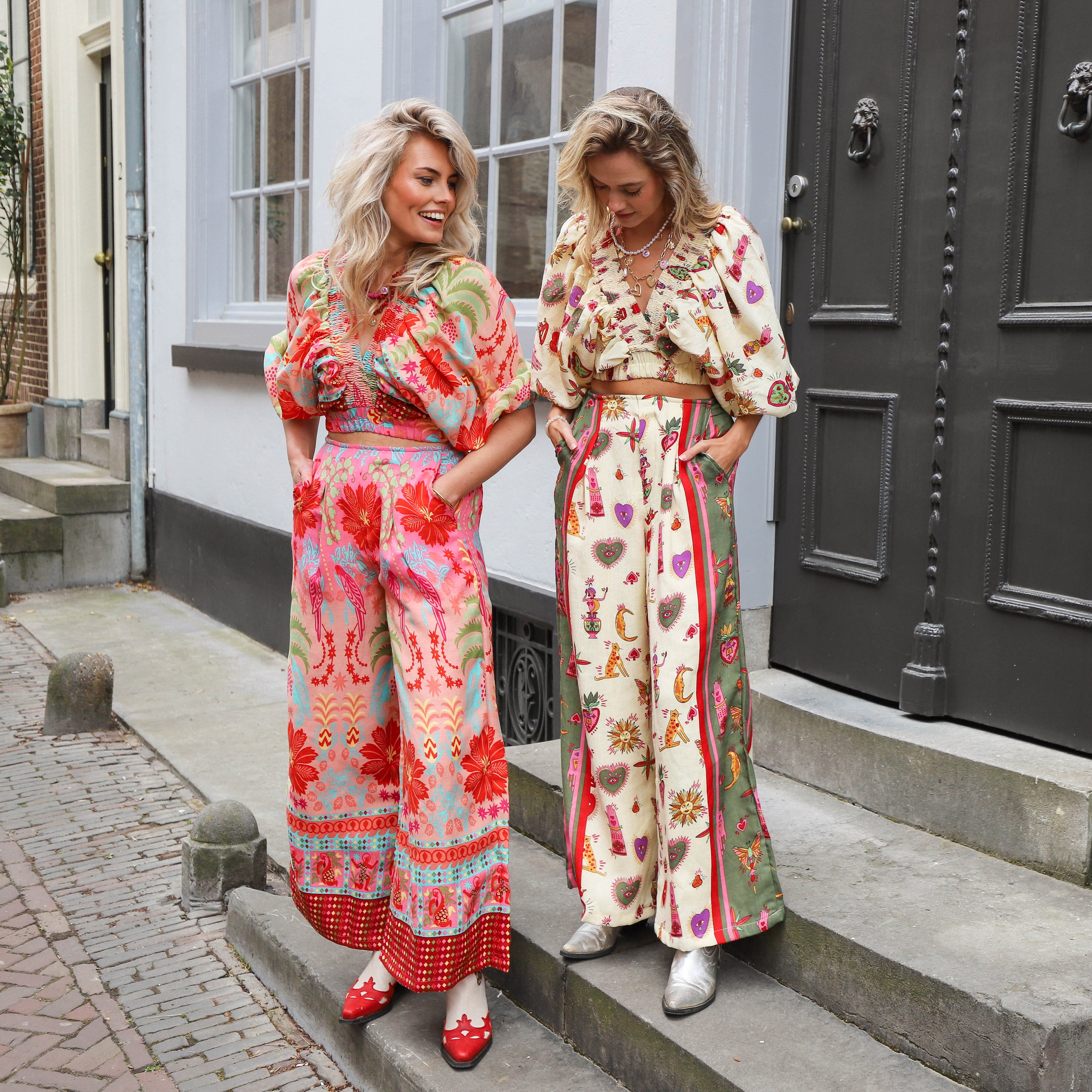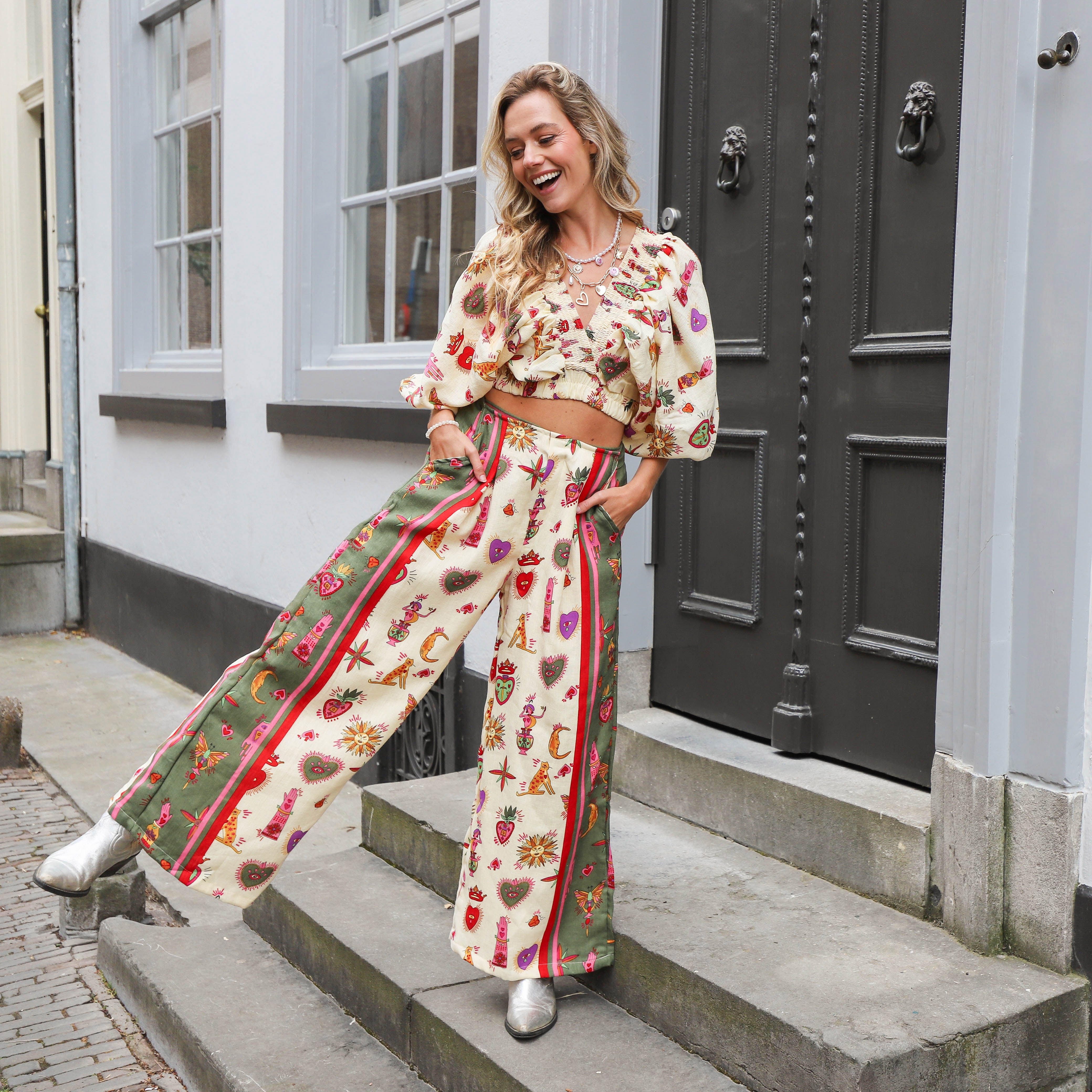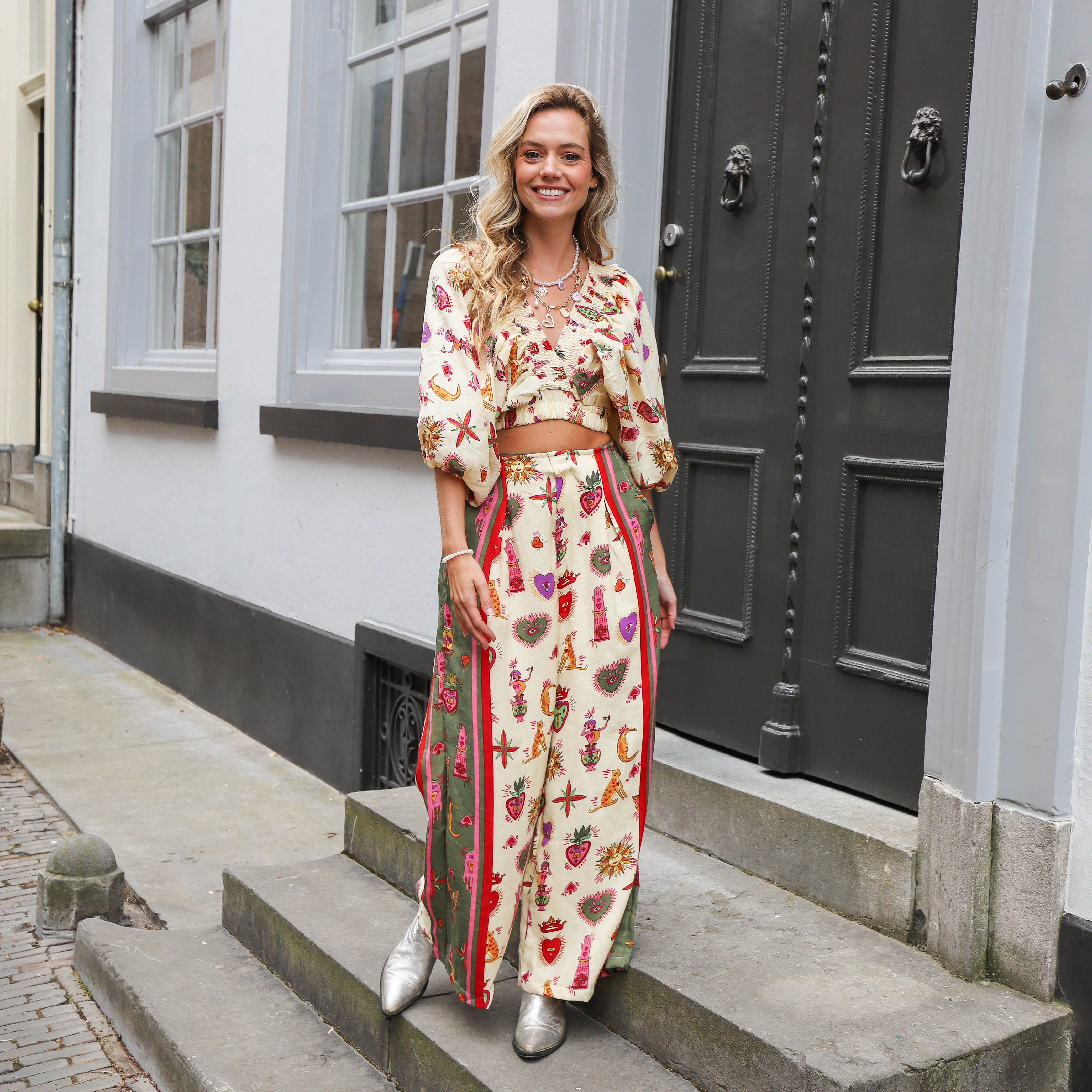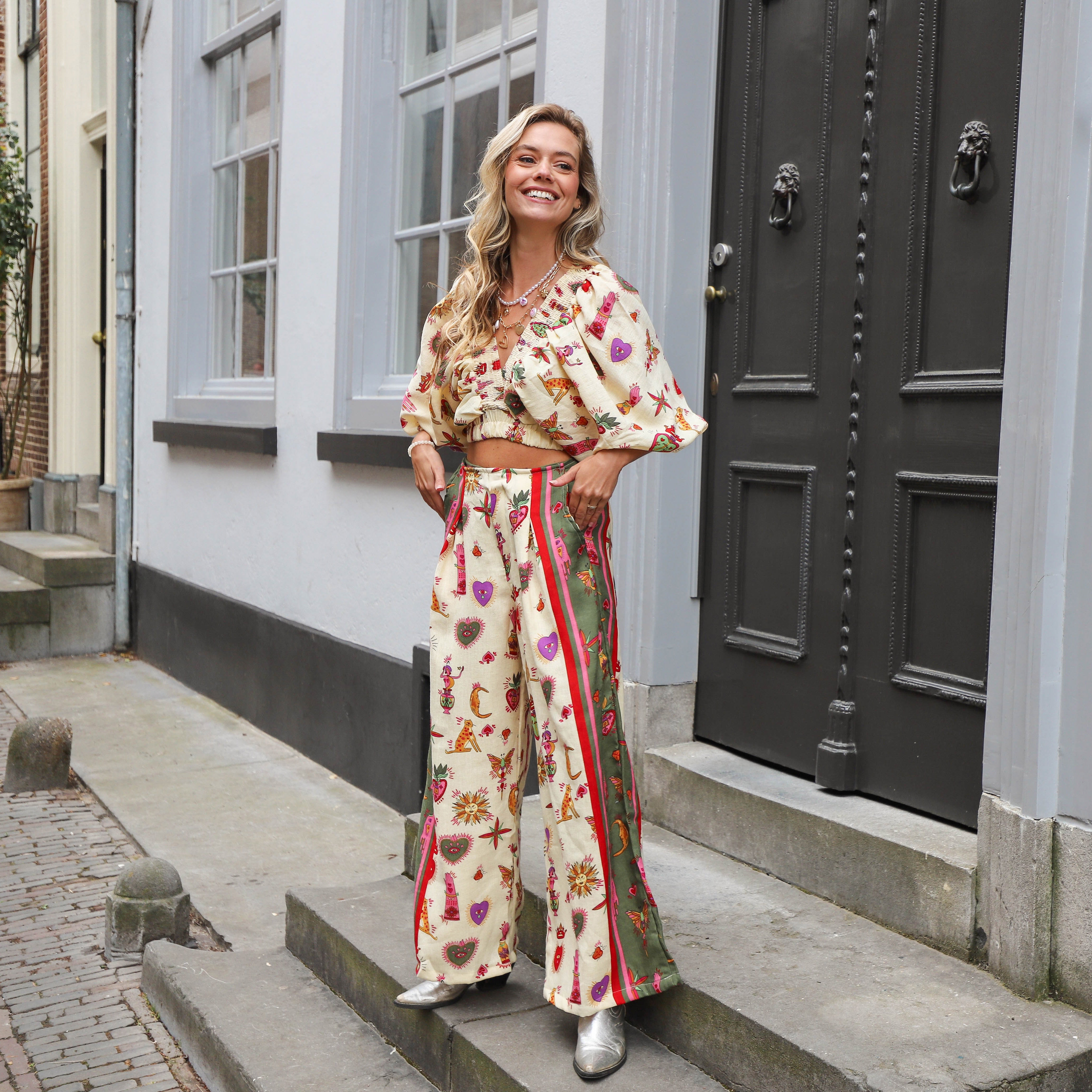 Deze vrolijke tweedelige set in ecru met een unieke roze en khaki print is een echte eyecatcher. De set bestaat uit een trendy cropped top met pofmouwen en smockwerk details, en een comfortabele wijde broek met een relaxte pasvorm. Samen vormen ze een complete en stijlvolle look voor de zomer.