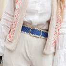 Mooie gevlochten blauwe riem met een witte rand. De riem heeft een grote ronde gesp en is leuk te combineren met een jurk of broek.