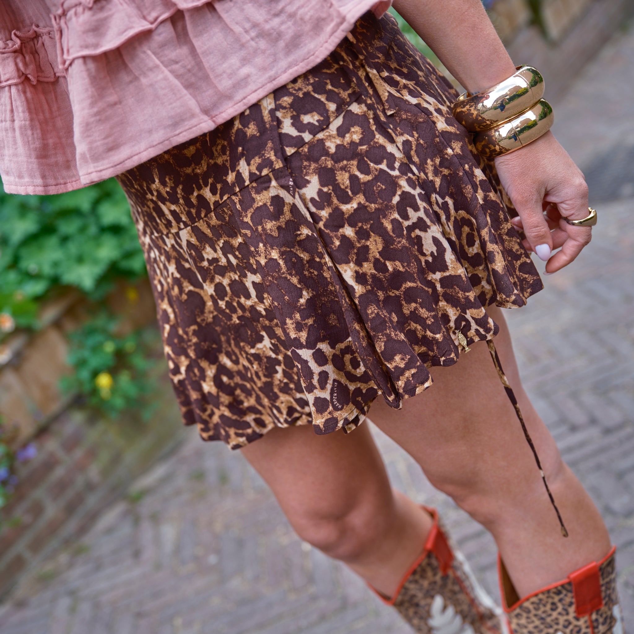 Deze romantische Leona Skirt is een droom voor de zomer! De rok heeft een prachtige all-over luipaardprint in bruin- en zwarttinten, wat zorgt voor een stoere en elegante uitstraling. De zijdezachte stof en de flatterende pasvorm geven de rok een speels en vrouwelijk karakter. Met zijn kortere lengte is deze rok perfect voor warme dagen en avonden.