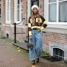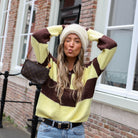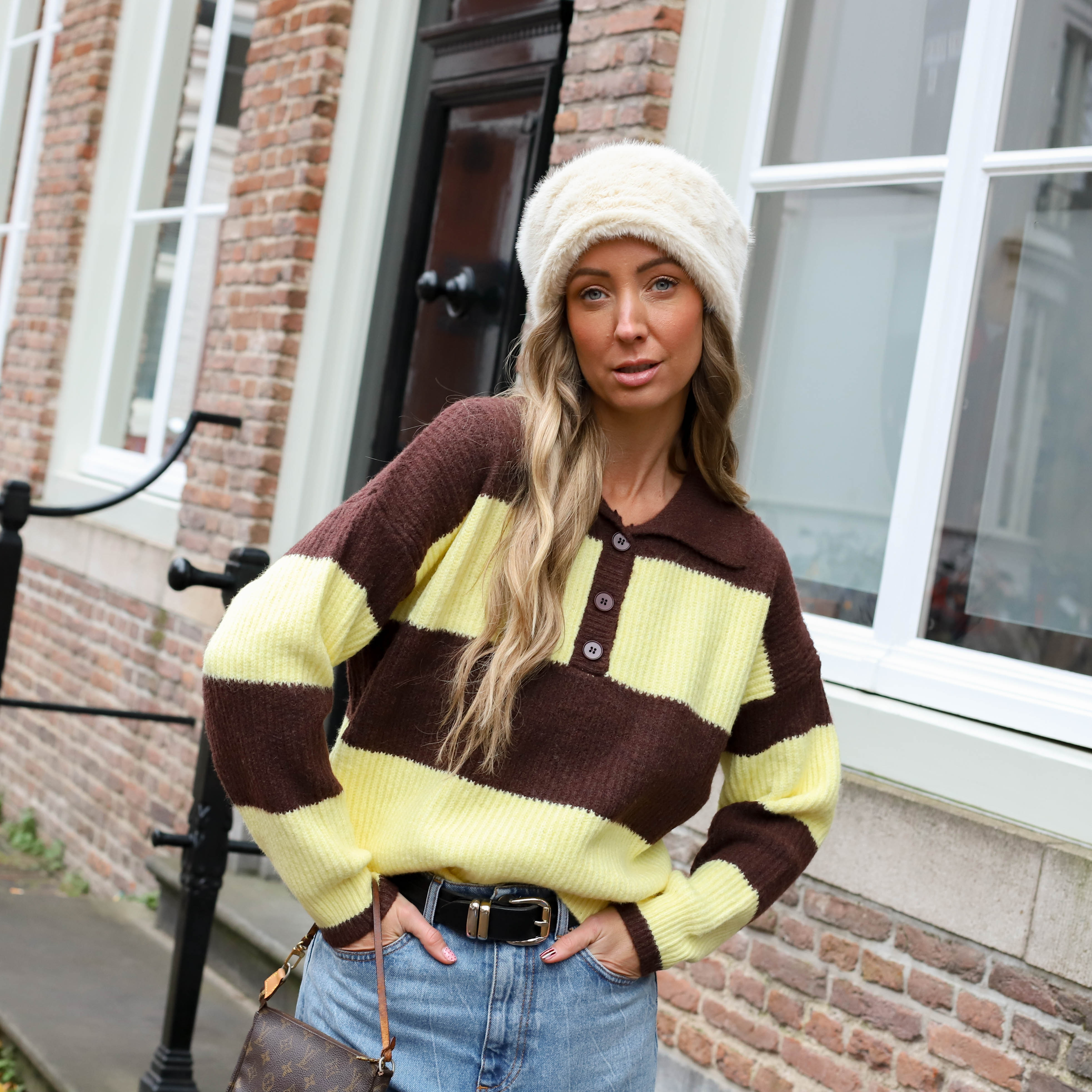 Deze Polo Trui is een zachte en trendy gebreide trui. De trui heeft opvallende horizontale strepen in warm geel en donkerbruin en is voorzien van een klassieke polokraag met knoopsluiting. De ruime, cropped pasvorm met verlaagde schoudernaden maakt dit een comfortabel en stijlvol item.