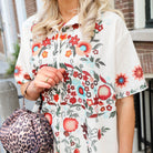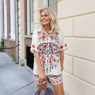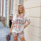 Deze charmante set bestaat uit een luchtig overhemd met korte mouwen en een bijpassend shortje, beide versierd met een rijk en kleurrijk bloemenpatroon in roestbruin, blauw en groen op een off-white basis. De lichte mix van polyester en linnen maakt deze set comfortabel en ademend, perfect voor een zonnige dag of een ontspannen avond.
