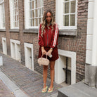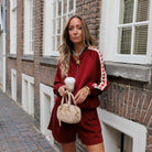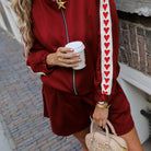 Deze complete set, bestaande uit een vestje en een broekje, is een sportieve en comfortabele toevoeging aan je garderobe. Gemaakt van een zachte stofmix, voelt de set heerlijk aan en biedt het een flexibele pasvorm. Het vestje is een bomberjack-stijl met een ritssluiting en contrasterende witte strepen met hartjes langs de mouwen. Het bijpassende broekje heeft een elastische tailleband met ruches.