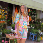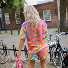 Hoe leuk is dit setje? Het shirt heeft een speels colourblock design met verschillende levendige patronen, waaronder tropische bloemen, papaya's, geruite vlakken en tekst. De kleuren variëren van roze, oranje en geel tot mintgroen en paars. Maak het af met een leuk tasje.