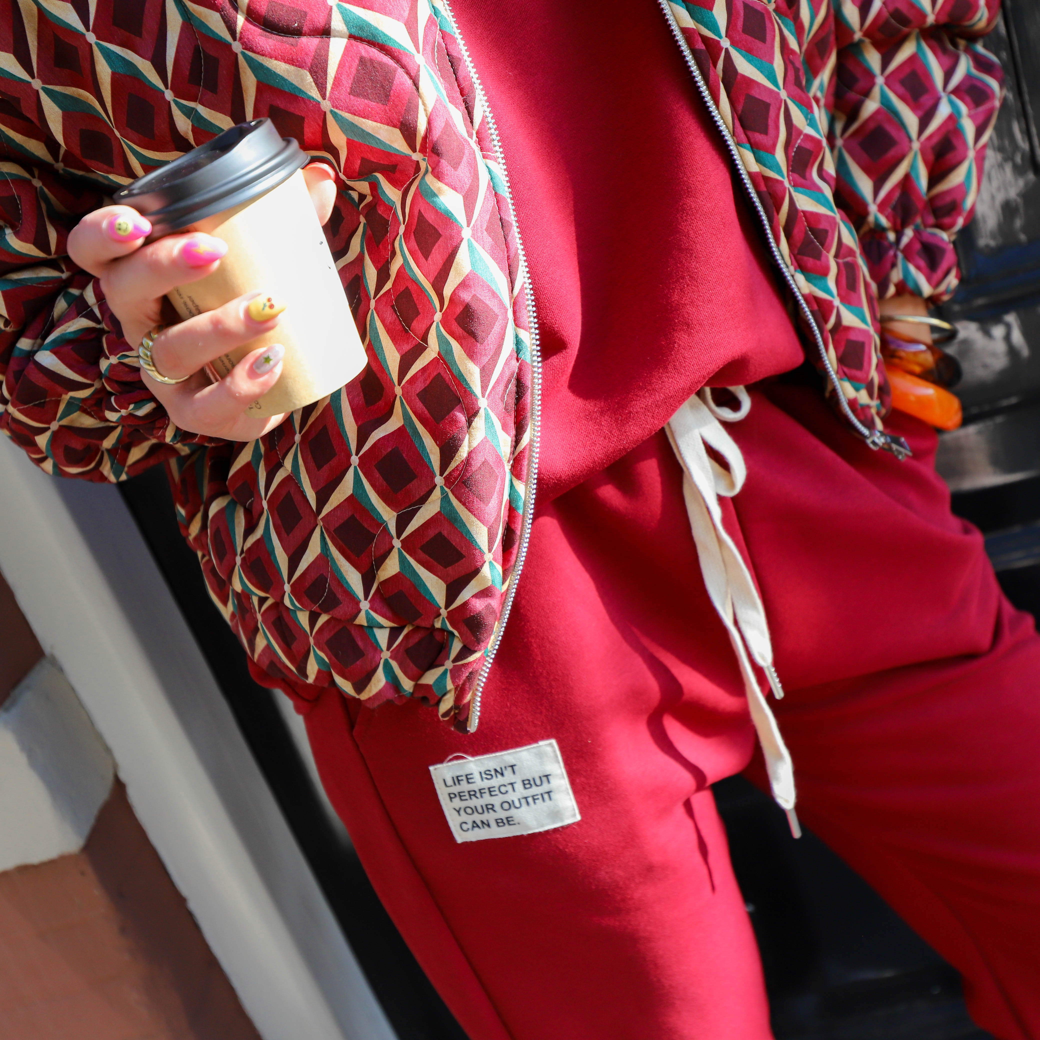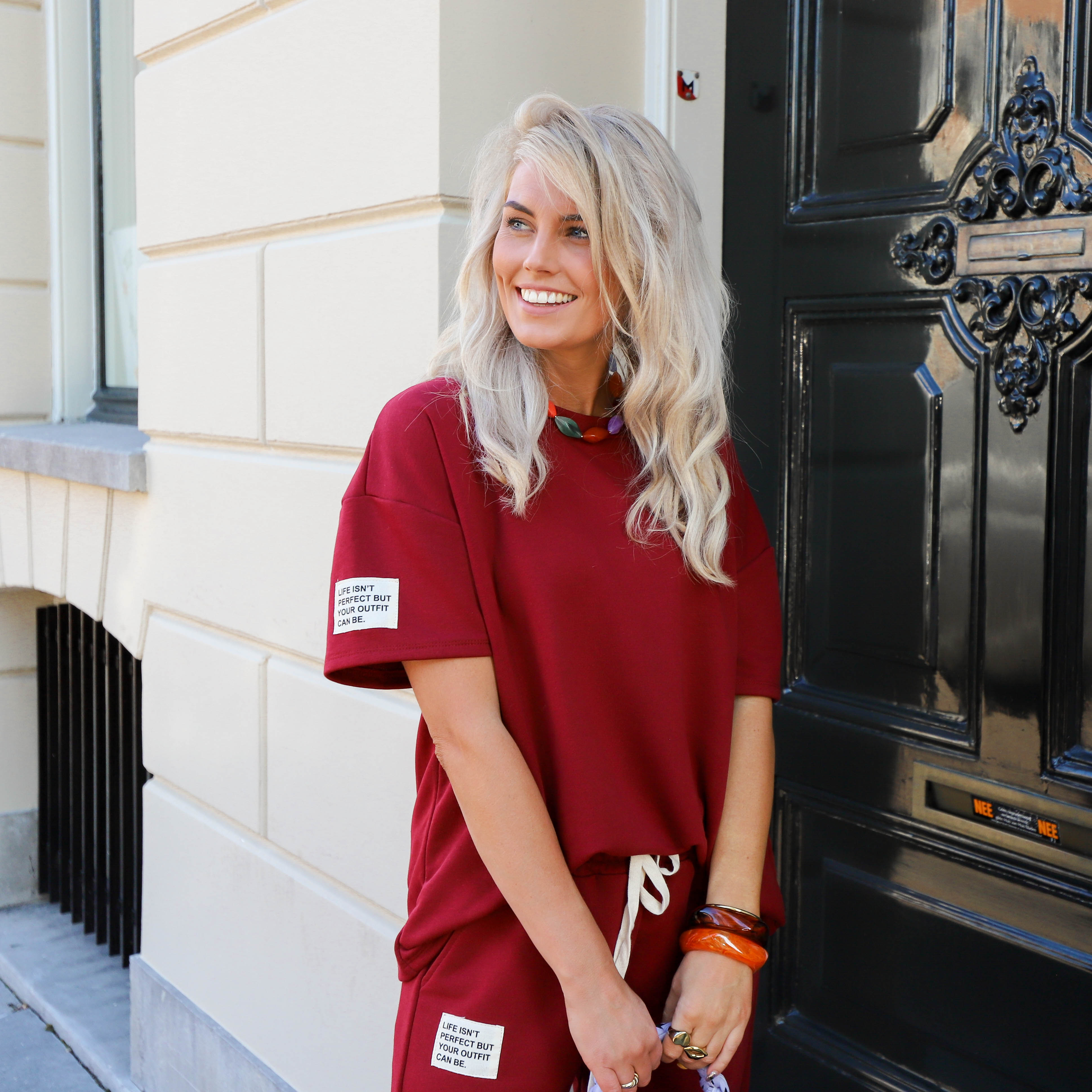 De bijpassende joggingbroek heeft een elastische tailleband met een trekkoord en is voorzien van een subtiele patch met de tekst "Life isn't perfect but your outfit can be". Zowel de broek als de top hebben een ruime pasvorm voor optimaal comfort.