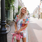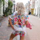 Dit leuke setje bestaat uit een overhemd met korte mouwen en een bijpassende short. De all-over bloemenprint in felle kleuren geeft de set een vrolijke uitstraling. De short heeft een elastische tailleband met een trekkoord voor een comfortabele pasvorm. Maak het af met een paar slippers.