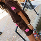 Ga voor de perfecte combinatie van comfort en stijl met dit 'jogging set' in een bruine kleur. De set bestaat uit een T-shirt en bijpassende shorts, ideaal voor een relaxte dag thuis of een casual dagje uit. De shorts zijn voorzien van een elastische tailleband met een verstelbaar trekkoord, wat zorgt voor een perfecte pasvorm. De opgestikte zakken en de subtiele tekstpatch aan de zijkant geven de shorts een trendy look.