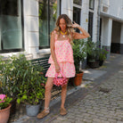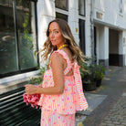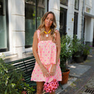 Dit schattige setje, perfect voor warme dagen, bestaat uit een top en een shortje. Beide items hebben een patroon van dunne oranje strepen en kleine roze hartjes op een witte achtergrond. De top heeft gerimpelde schouderbanden en een strikdetail op de rug, wat zorgt voor een speelse en charmante look. De onderkant van de top is elastisch voor een comfortabele pasvorm. Het shortje heeft een elastische tailleband.