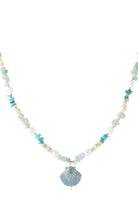 Mooi kettinkje met kleine steentjes en een schelp in blauw tinten.