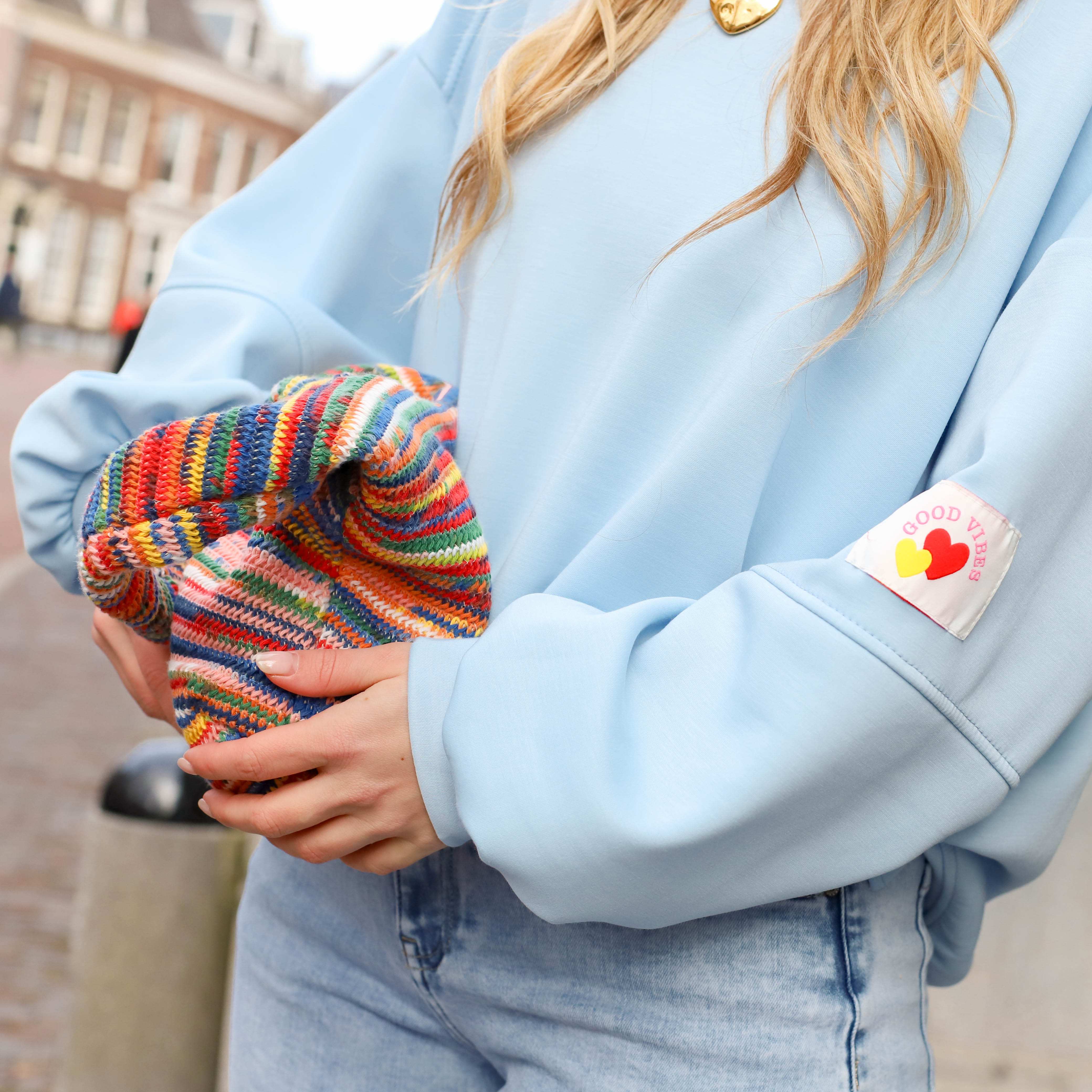 Oversized sweater good vibes lichtblauw mint