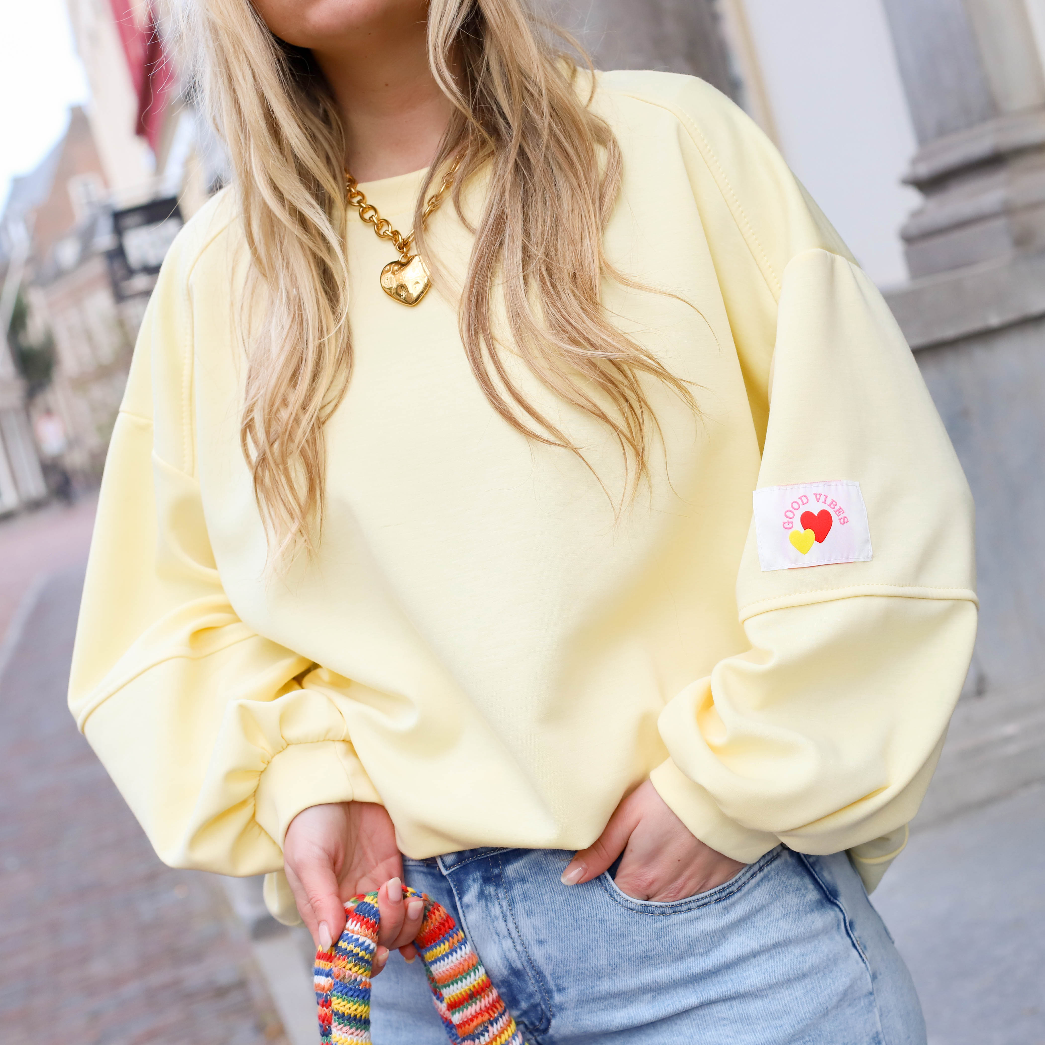 Oversized sweater good vibes geel