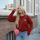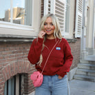Deze America Sweater is een opvallende en heerlijk zachte trui in een burgundy kleur. De trui heeft een fijne, harige textuur en een klassieke ronde hals.