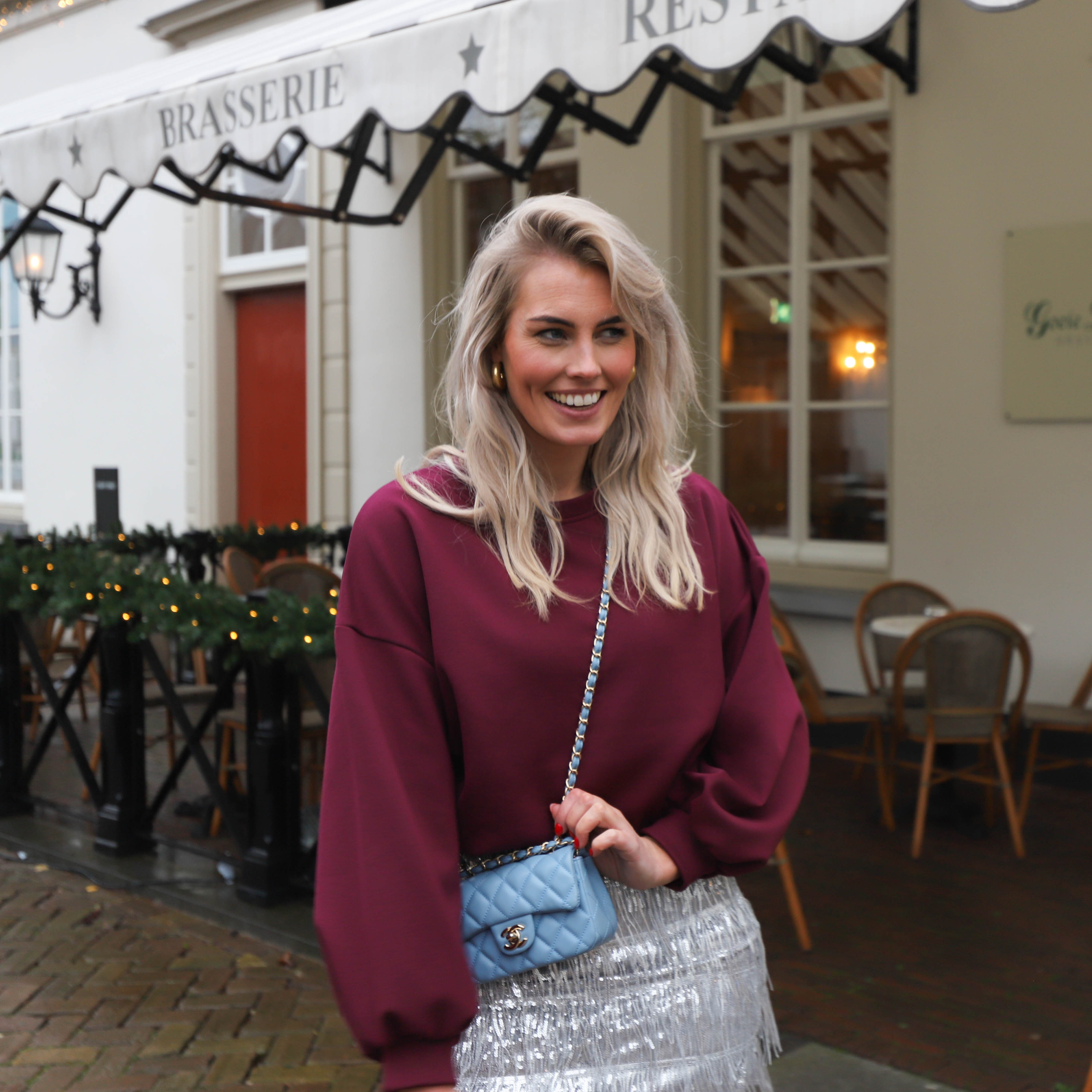 De trui heeft een klassieke ronde hals en een ruime, oversized pasvorm. De ballonmouwen en de brede manchetten zorgen voor een moderne touch.