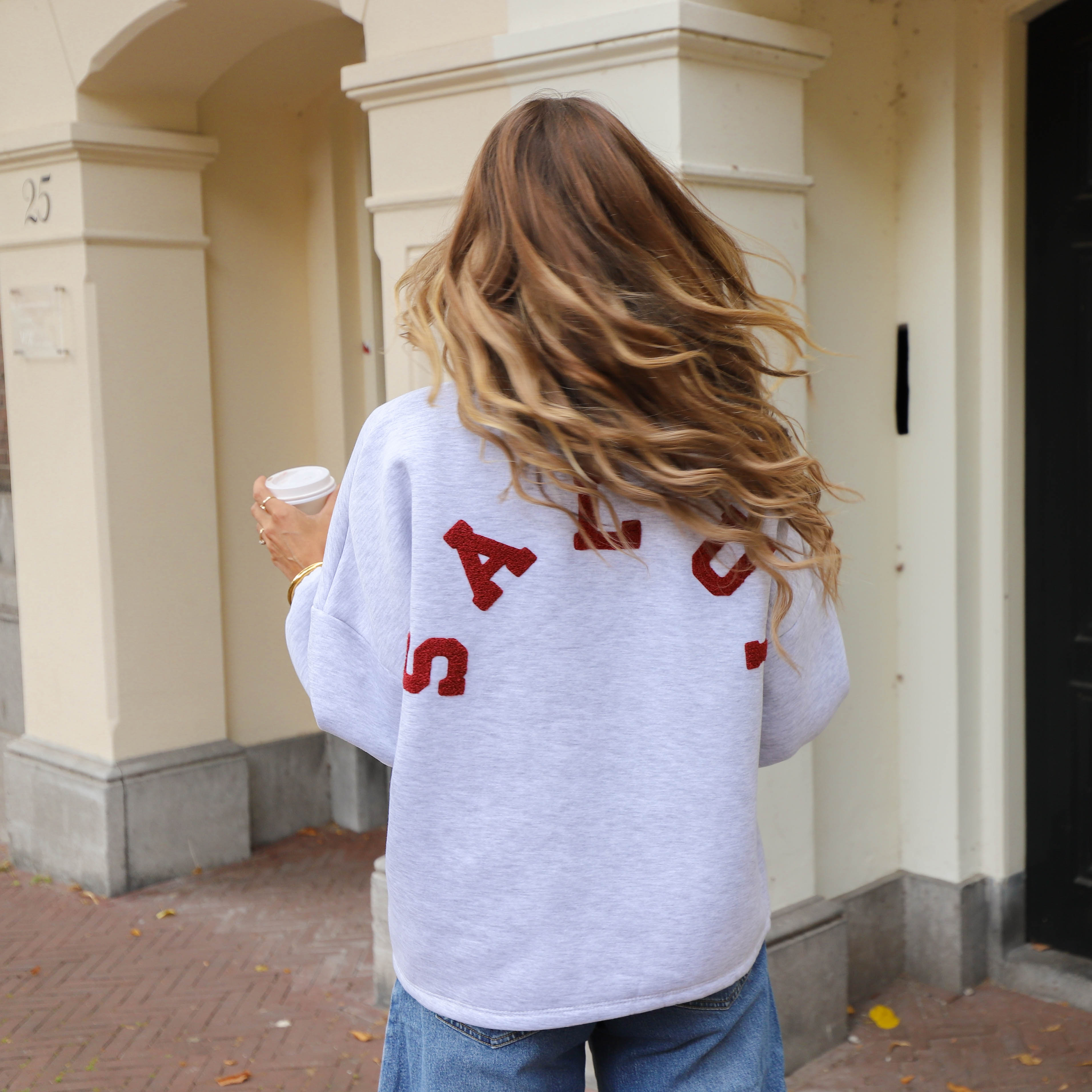 Geef je outfit een comfortabele en stoere twist met deze leuke sweater. Deze sweater heeft een klassieke ronde hals. De sweater heeft een ruime, comfortabele pasvorm en is op de achterkant voorzien van de tekst 'SALUT' in een zacht, bordeaux teddy materiaal.