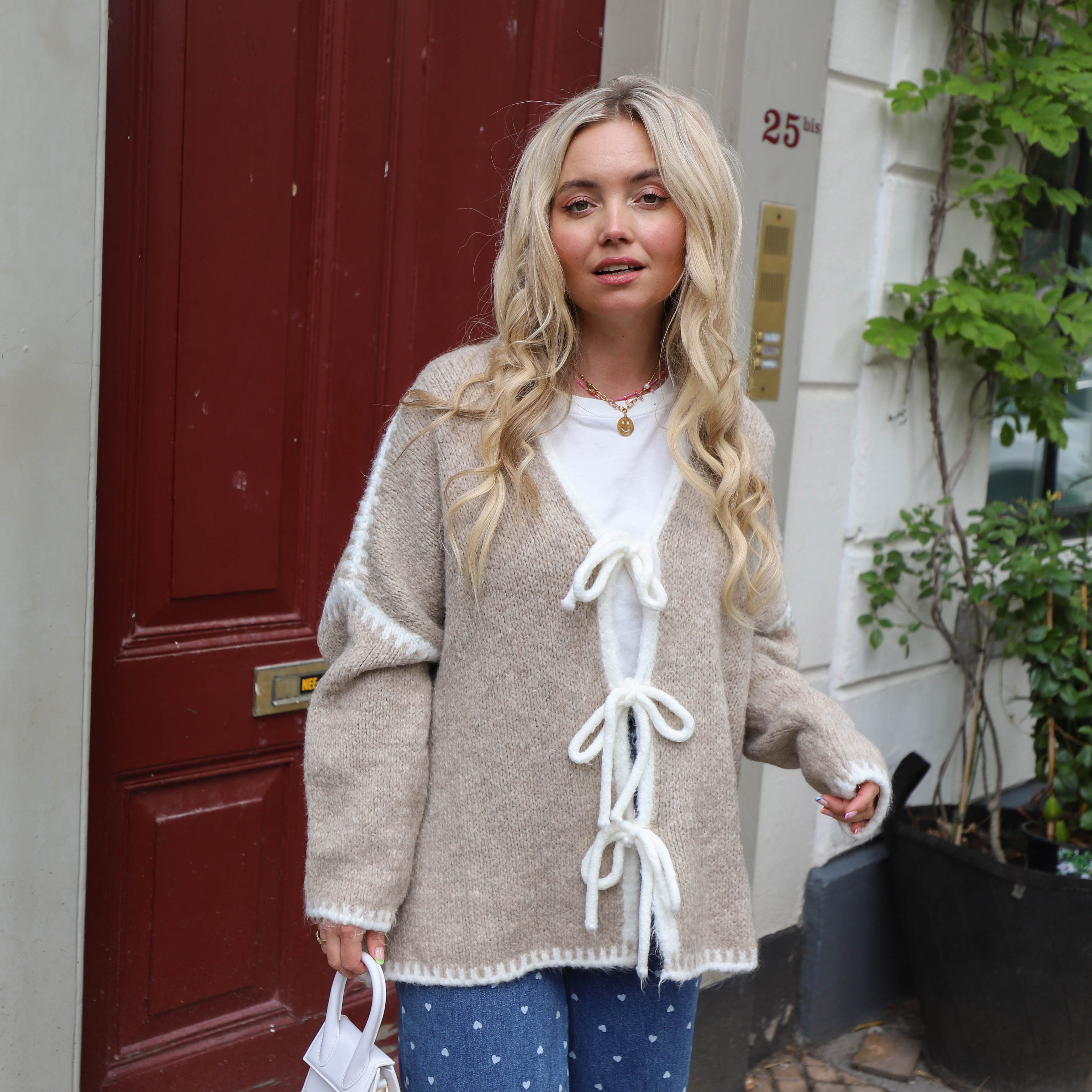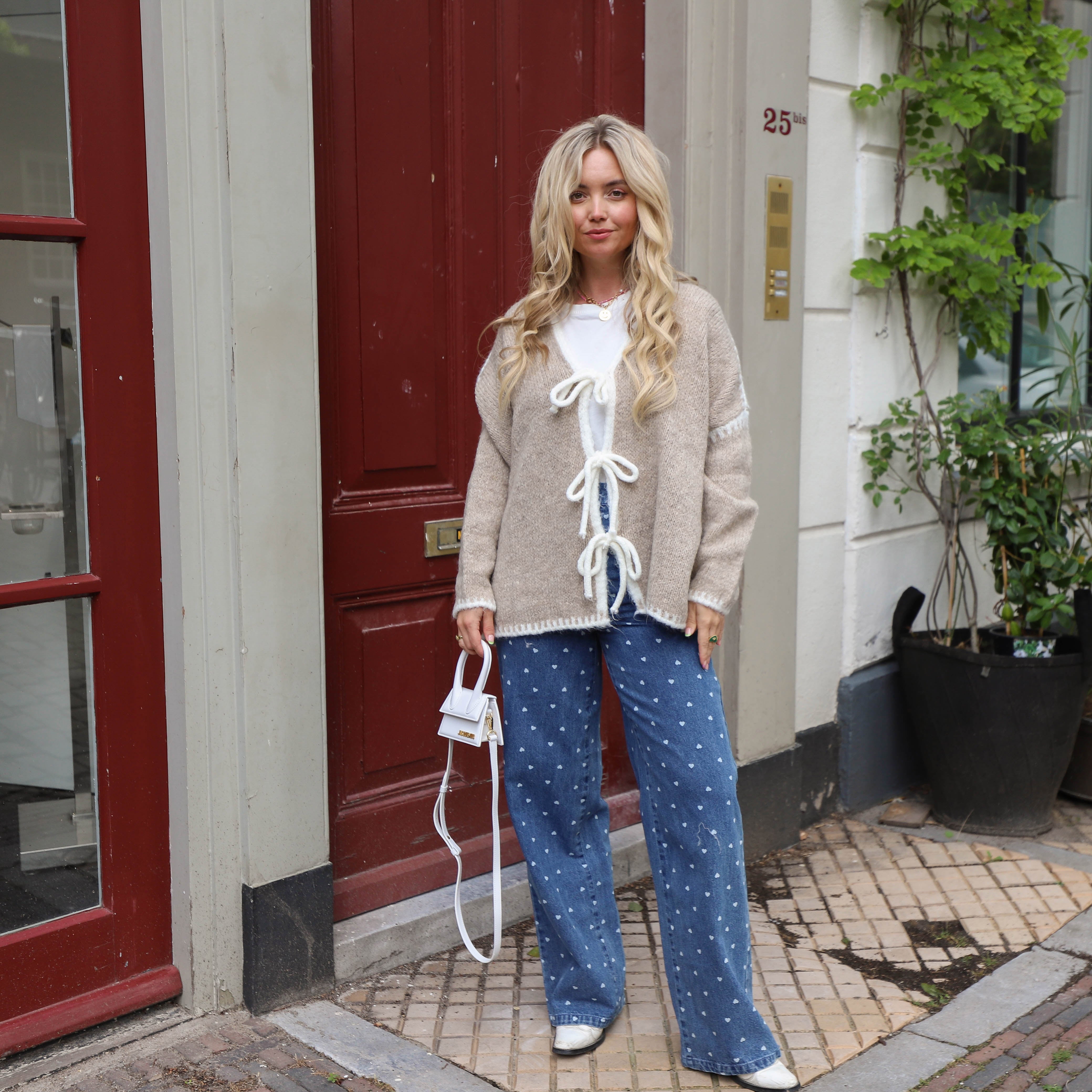 Mooi vestje in het beige met witte stiksels. Het vestje heeft strikken aan de voorkant. Het vestje heeft een oversized model en staat leuk met een jeans.