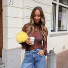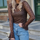 Geef je outfit een romantische en trendy twist met deze prachtige bruine kanten top. De top heeft een aansluitend model en is gemaakt van een semi-transparante kanten stof met een uniek patroon. De top heeft lange mouwen met een leuke uitlopende rand, wat zorgt voor een elegante look.