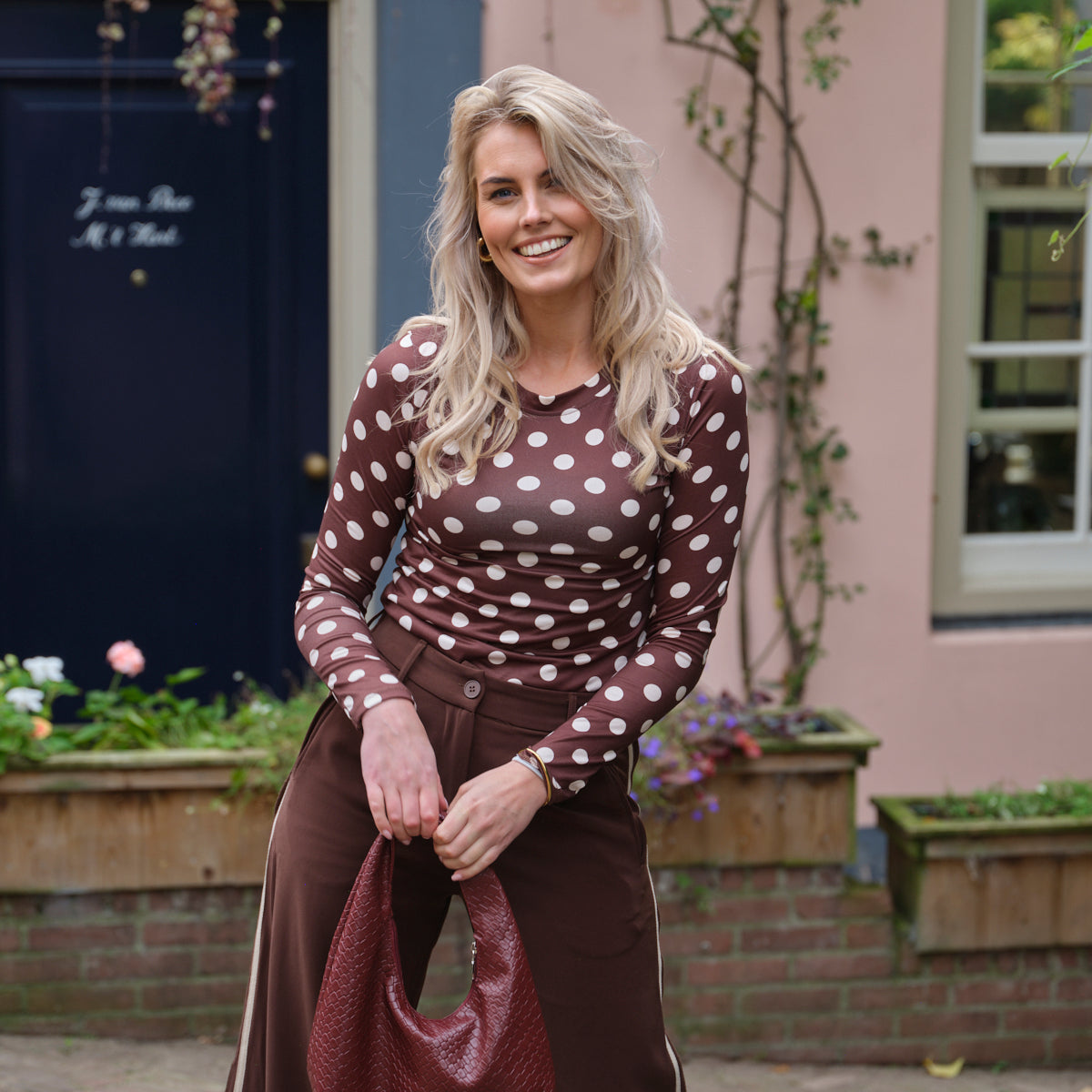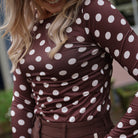 Deze Polka Top is een tijdloze, strakke top die een classy detail toevoegt aan elke layering look. De top is uitgevoerd in een diepe bruine kleur met een vrolijk, all-over wit stippenpatroon. De stof is dun, rekbaar en valt nauwsluitend. De ronde hals en lange mouwen maken deze top perfect om te dragen onder een blazer, een vest of een slip dress. Style 'm met een hoge taille broek en een paar hakken voor een retro-chique uitstraling.