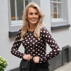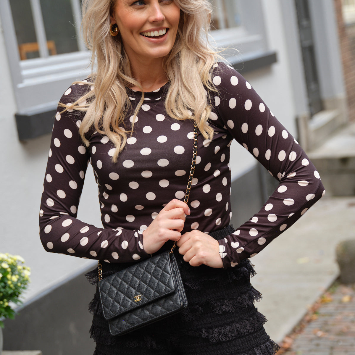 Deze Polka Top is een tijdloze, strakke top die een classy detail toevoegt aan elke layering look. De top is uitgevoerd in een zwarte kleur met een vrolijk, all-over wit stippenpatroon. De stof is dun, rekbaar en valt nauwsluitend. De ronde hals en lange mouwen maken deze top perfect om te dragen onder een blazer, een vest of een slip dress. Style 'm met een hoge taille broek en een paar hakken voor een retro-chique uitstraling.