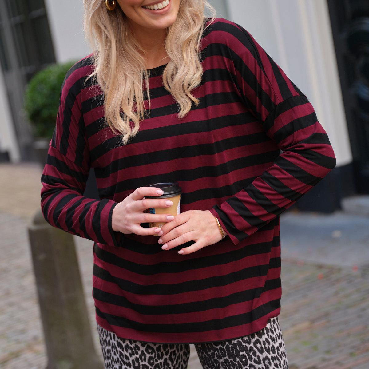 Deze Streep Top is een must-have basic met een chique twist. De top is uitgevoerd in een klassiek horizontaal streepdessin in een levendige combinatie van burgundy en bruin. De soepelvallende stof, de elegante wijde boothals en de oversized pasvorm maken deze top perfect voor een nonchalante, maar verzorgde look.