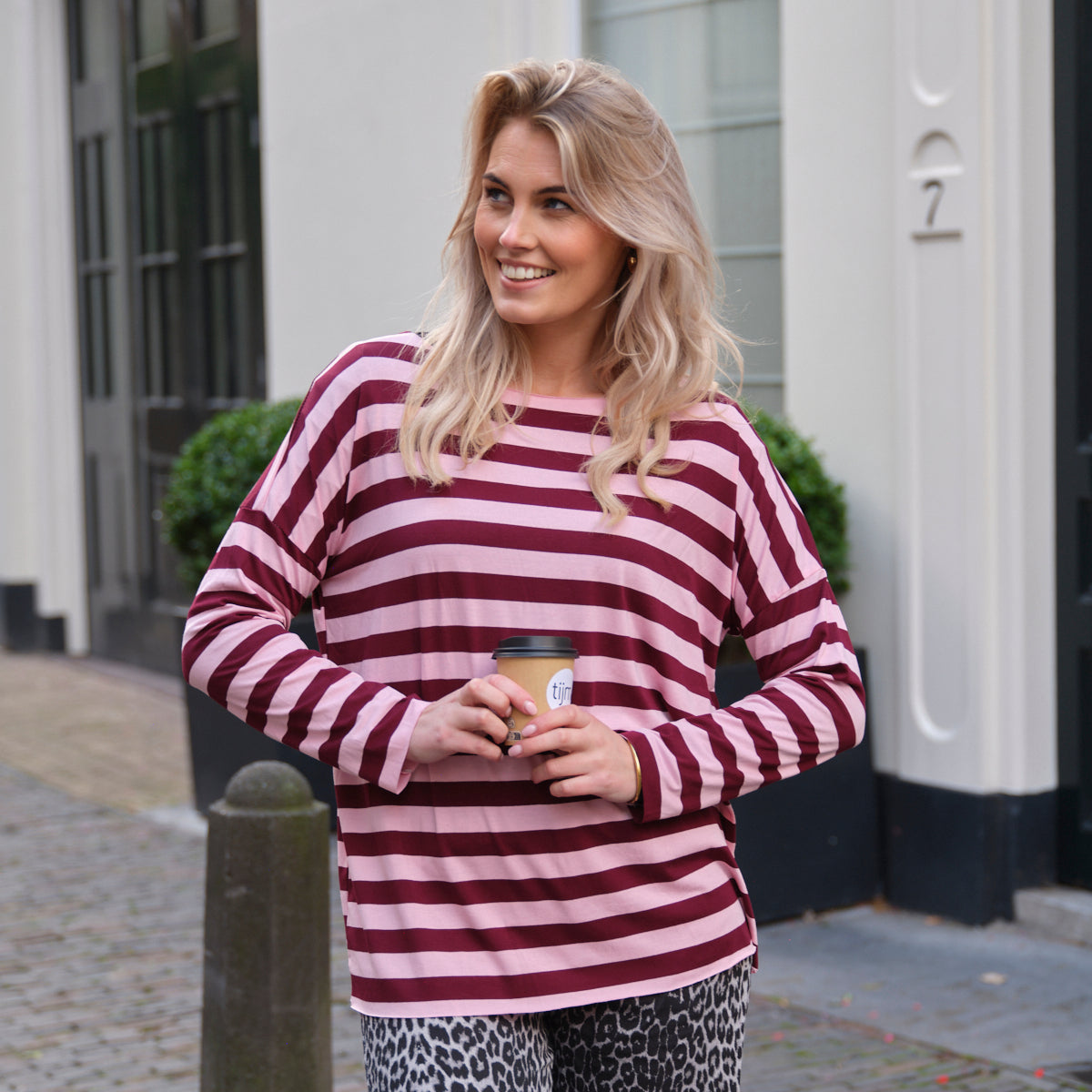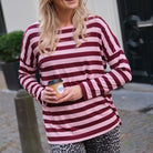 Deze Streep Top is een must-have basic met een chique twist. De top is uitgevoerd in een klassiek horizontaal streepdessin in een levendige combinatie van burgundy en roze. De soepelvallende stof, de elegante wijde boothals en de oversized pasvorm maken deze top perfect voor een nonchalante, maar verzorgde look.