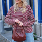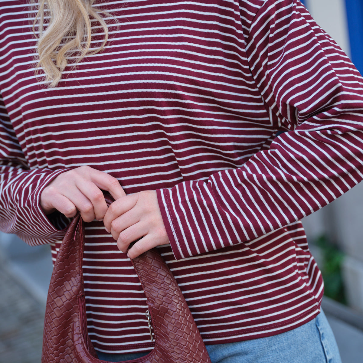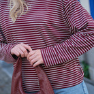 Deze Streep Top is een must-have basic met een chique twist. De top is uitgevoerd in een diepe bordeauxrode kleur met fijne witte strepen en heeft een comfortabele, licht oversized pasvorm. De ronde hals en lange mouwen maken deze top perfect voor elke dag. Dankzij de katoen-elastane mix voelt de stof zacht aan en heeft deze een fijne stretch. Style 'm onder een blazer voor een nette look, of draag hem casual op een jeans of leren broek.