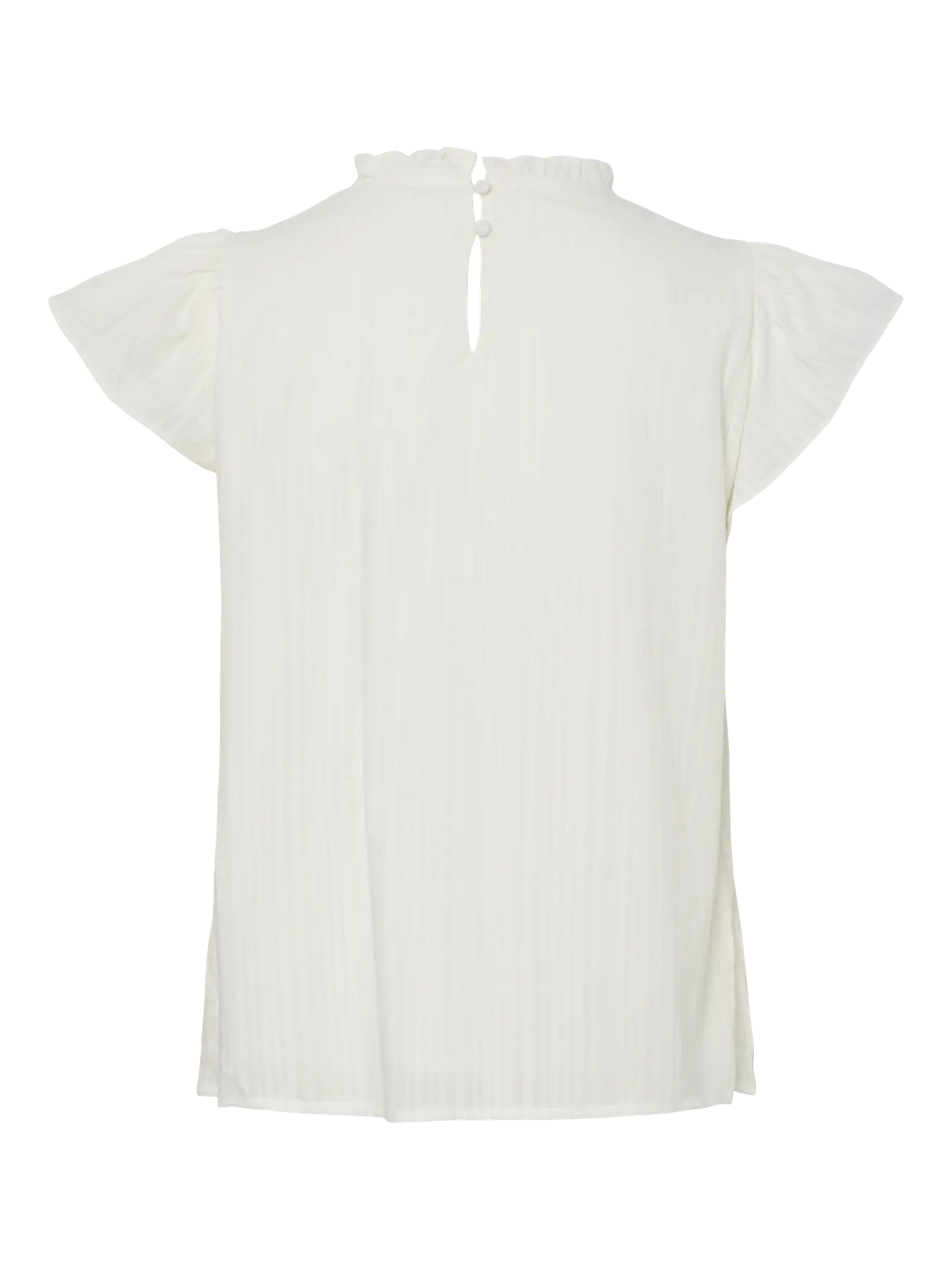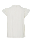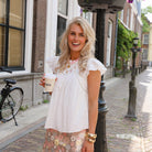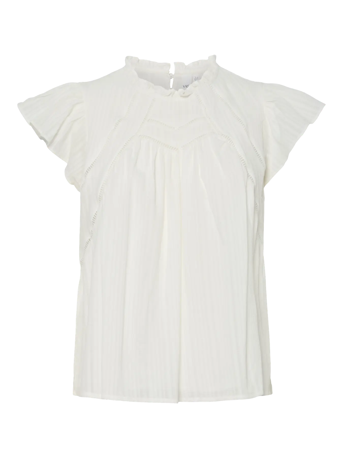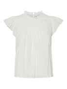 De top heeft een sierlijke hoge hals met een subtiel ruchekraagje en delicate opengewerkte details over de borst, wat een romantische en vrouwelijke uitstraling geeft. De korte mouwtjes en de relaxte pasvorm maken deze top perfect voor een comfortabele en stijlvolle look.