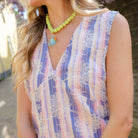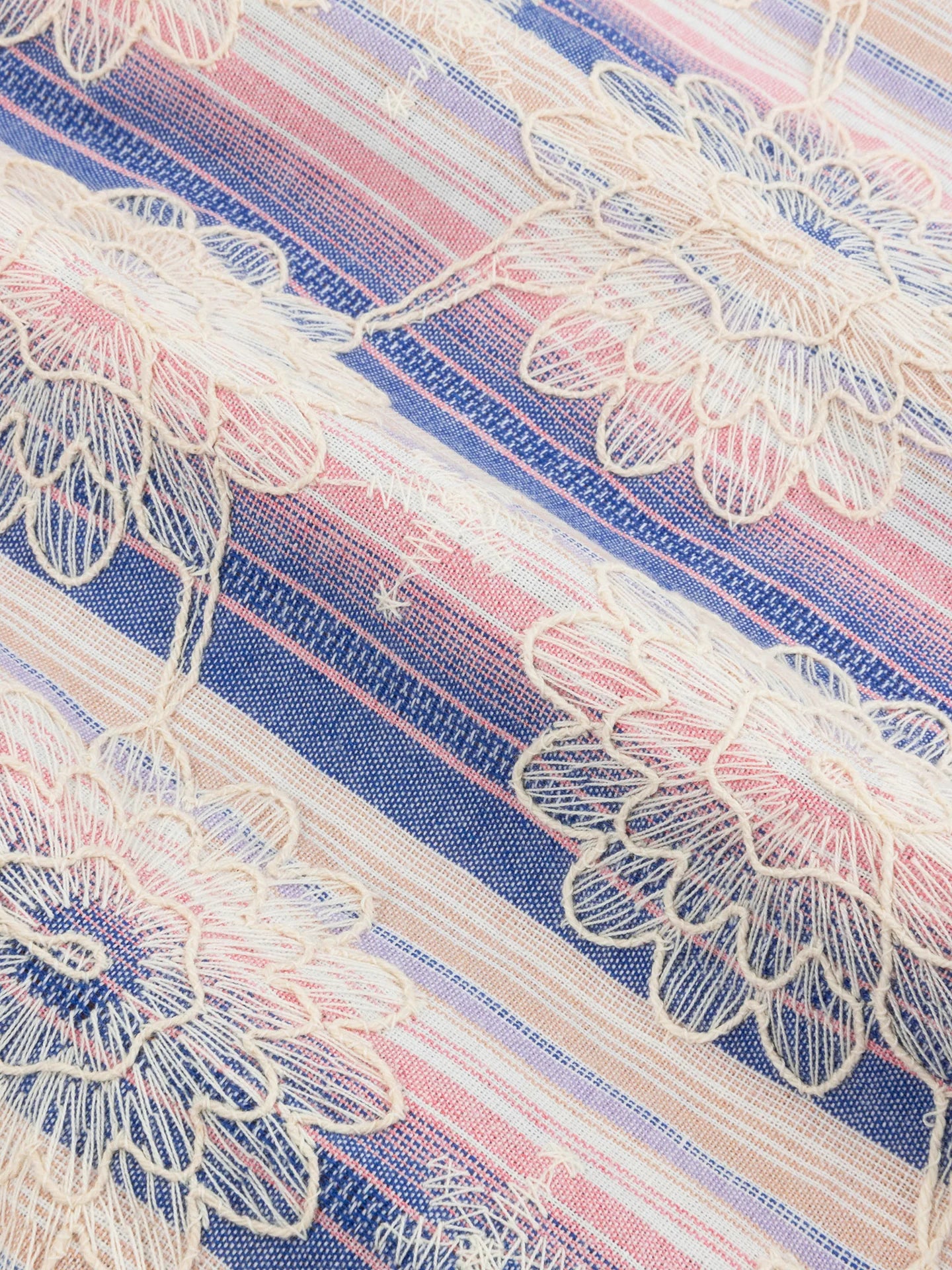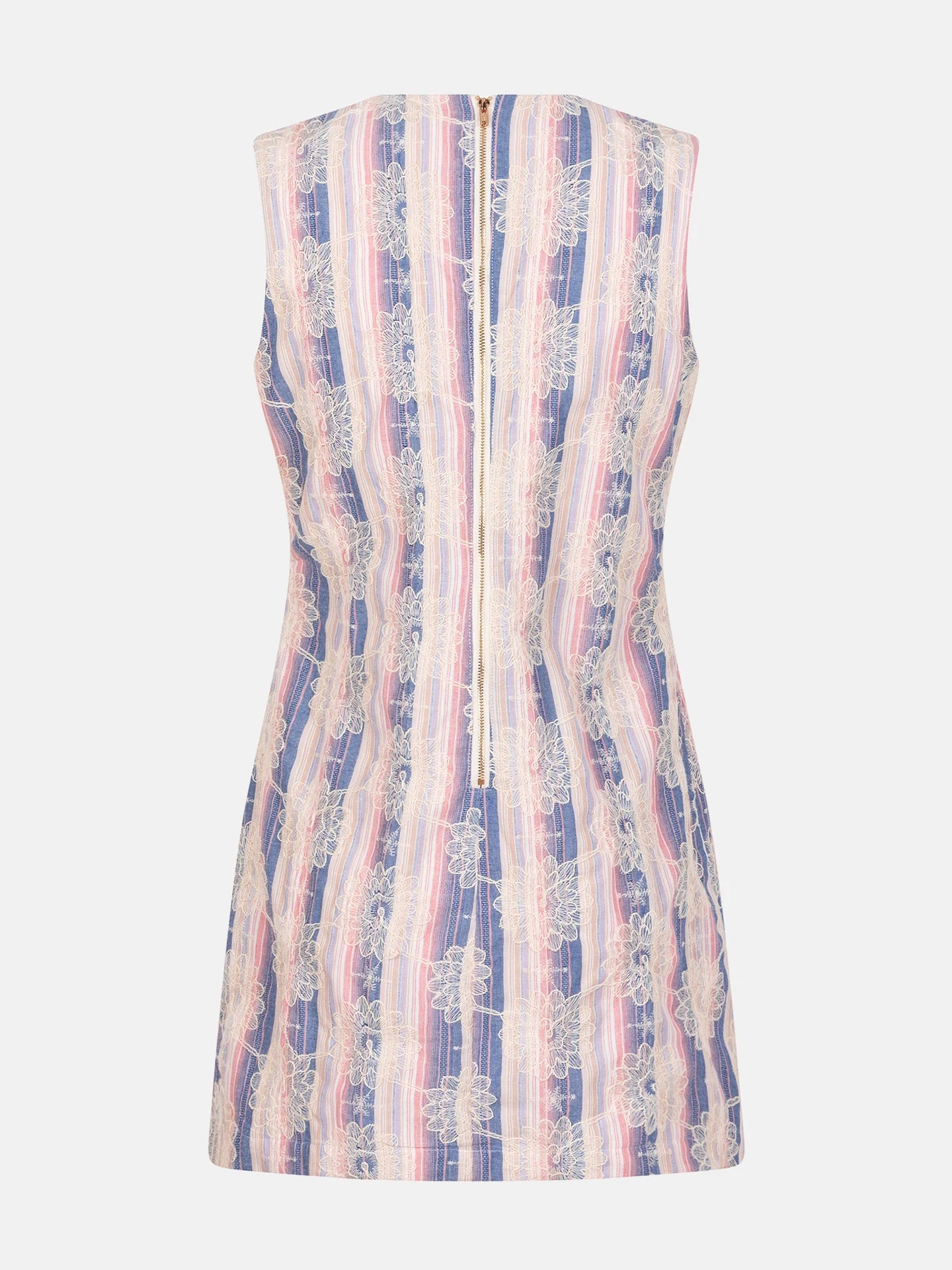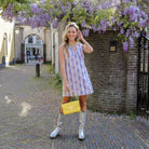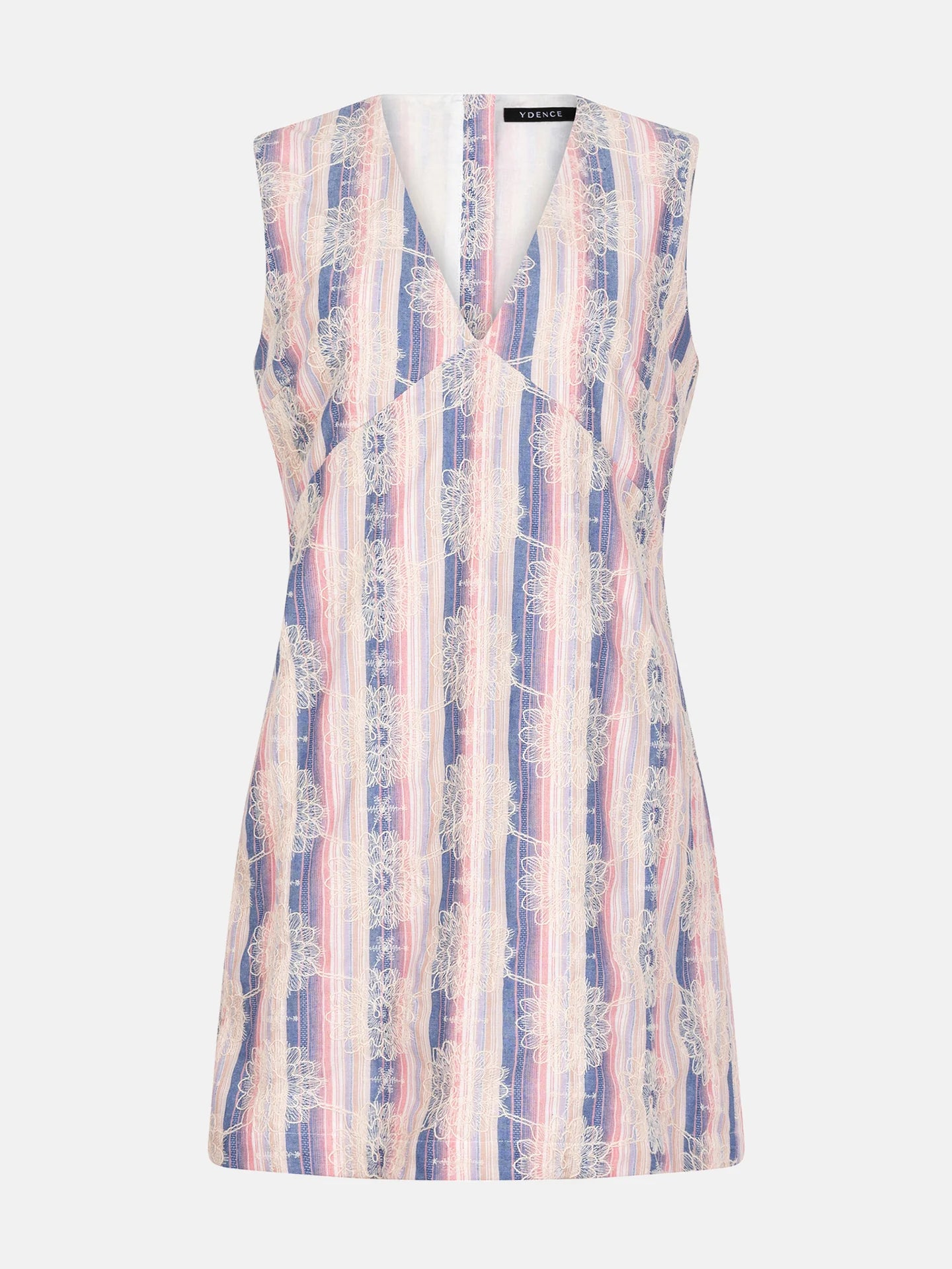 Dress Ariane is een luchtige en vrouwelijke jurk zonder mouwen met een subtiele V-hals en seam op de borst. De jurk heeft een A-lijn pasvorm en is afgewerkt met een sierlijk bloemenborduursel over verticale strepen in de kleuren blauw, roze en wit.