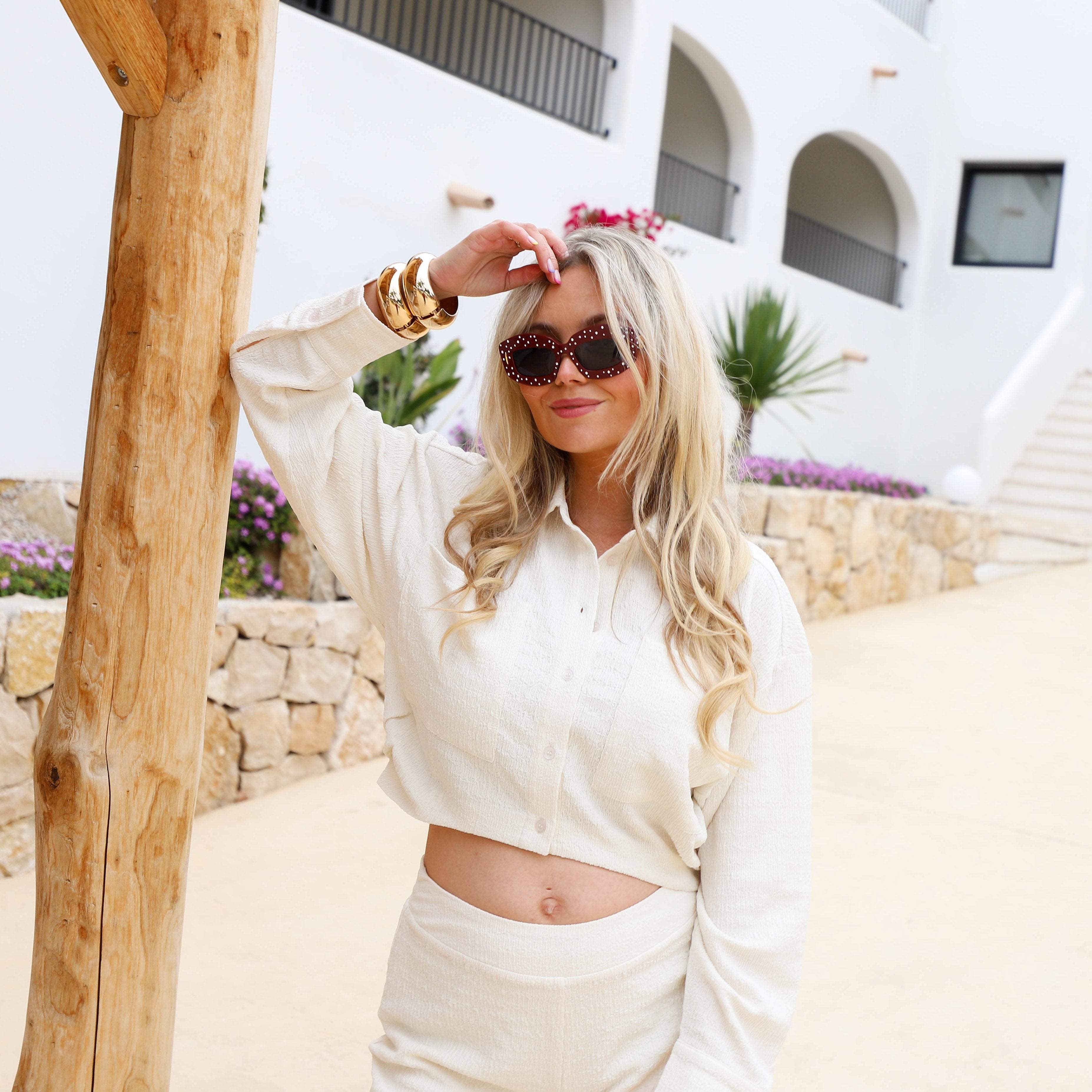 - Model: Ons model is 169 cm lang en draagt maat M