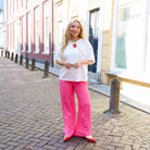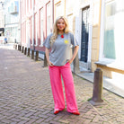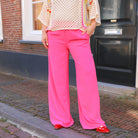 Maak een statement met deze opvallende fuchsia broek. De broek heeft een comfortabele elastische tailleband en een rechte, wijdvallende pijp. De soepele stof met een vleugje stretch zorgt voor een elegante en comfortabele pasvorm. Perfect om je outfit een kleurrijke boost te geven!