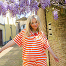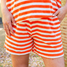 Zonovergoten dagen vragen om deze vrolijke oranje-wit gestreepte set! De top heeft een openvallende kraag en korte mouwen. Het bijpassende shortje maakt de zomerse look compleet.