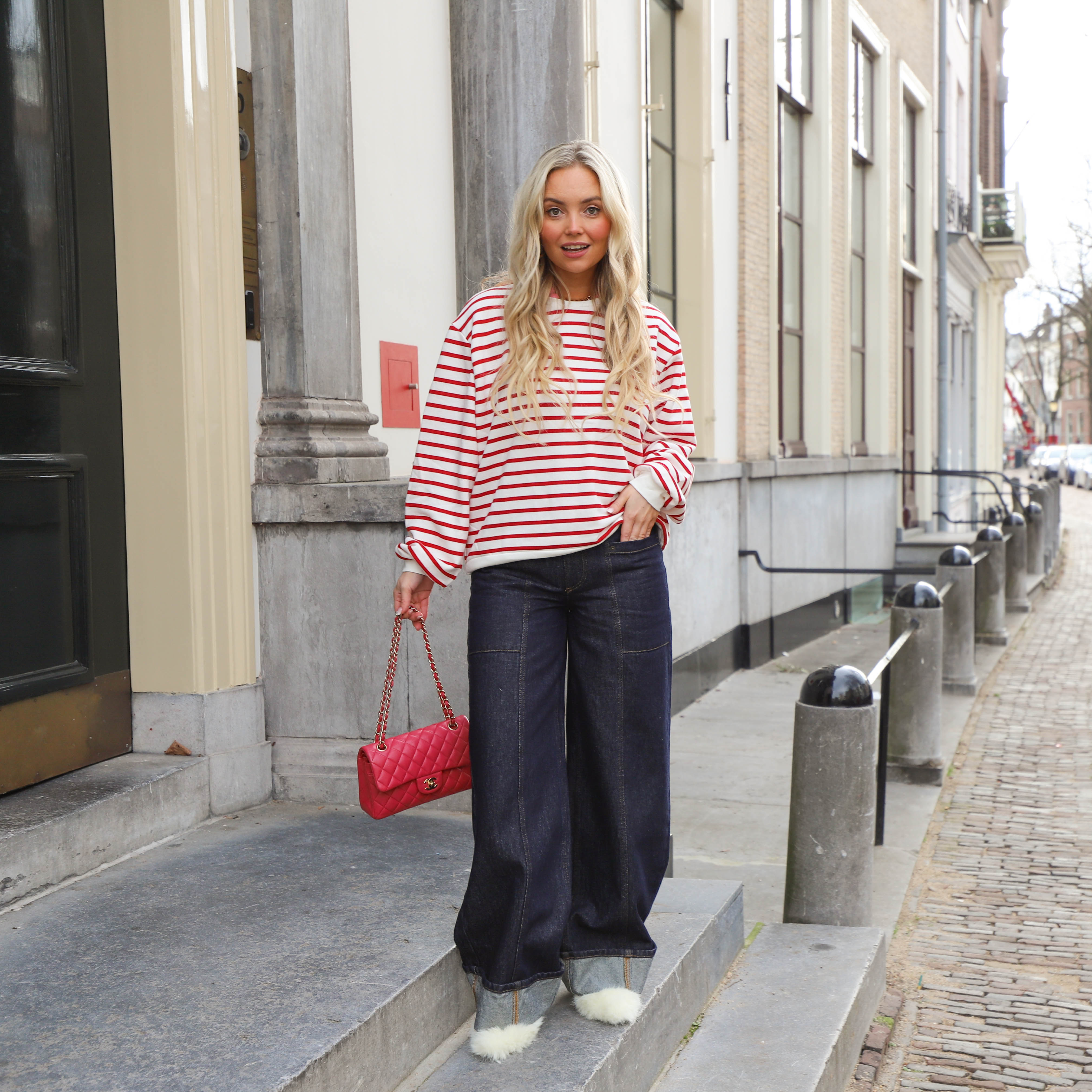 De trui heeft een ruime, rechte pasvorm, een ronde hals en lange mouwen. Het kleine, rode lippen-detail op de borst zorgt voor een speels, Parijs-achtig accent.