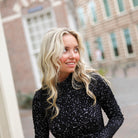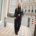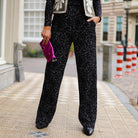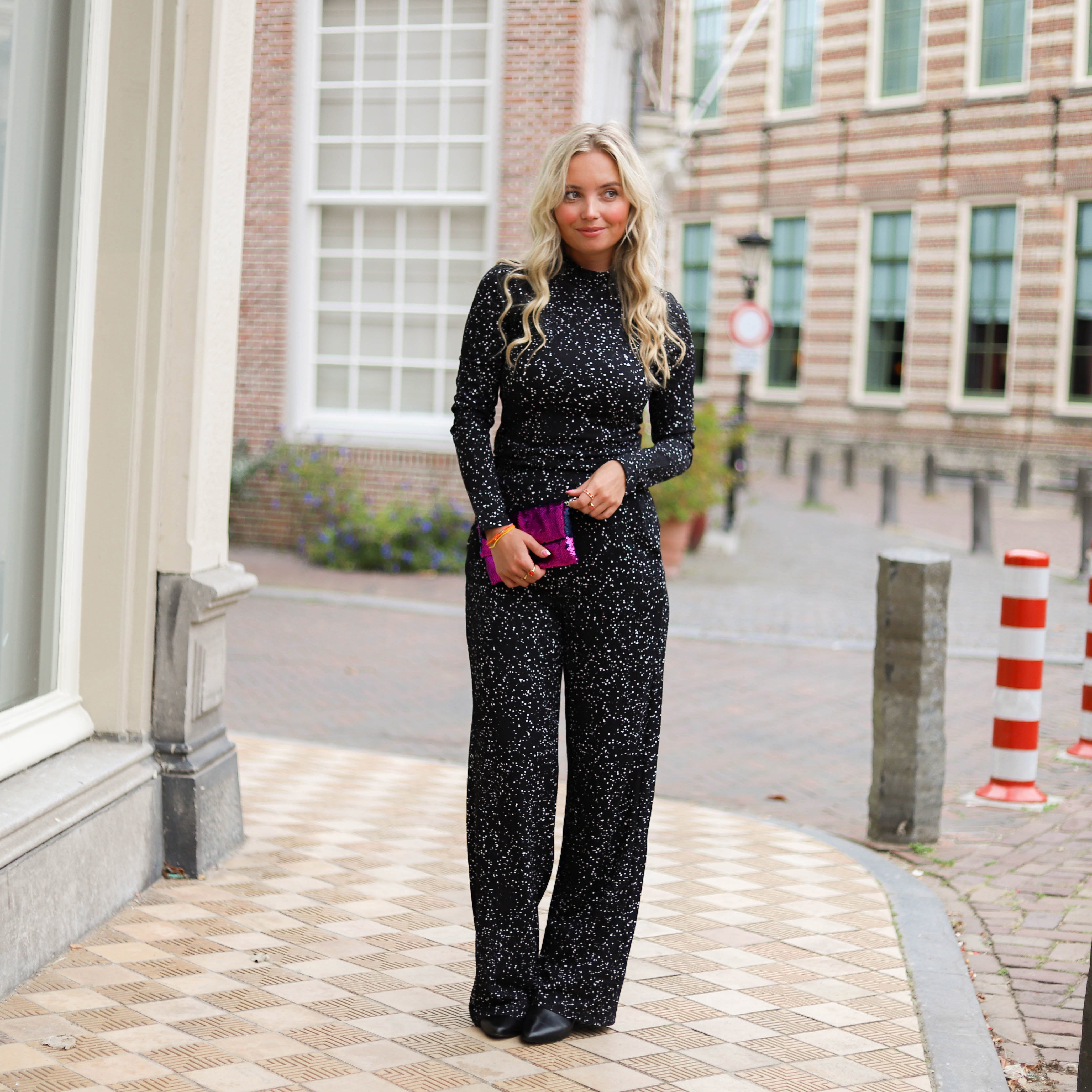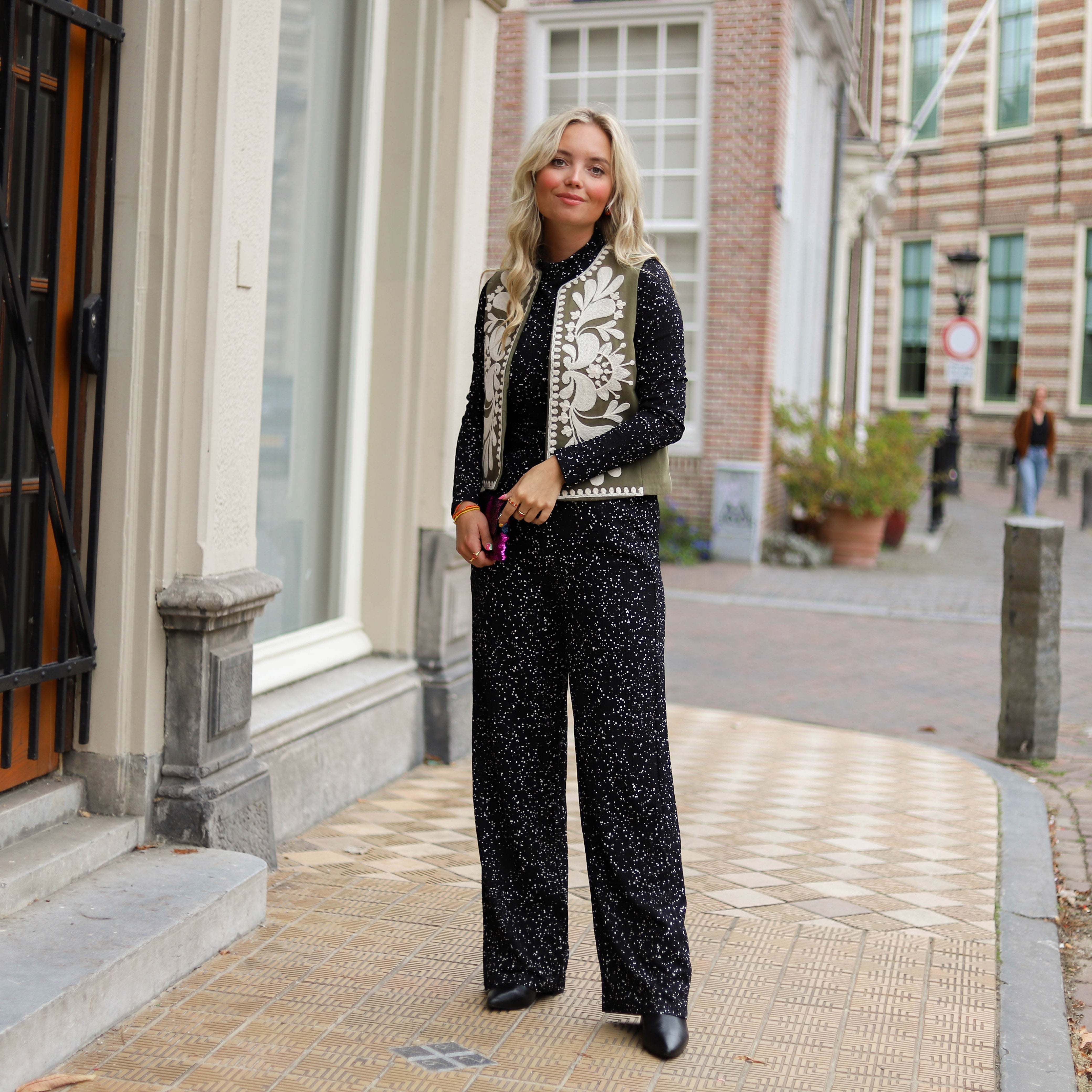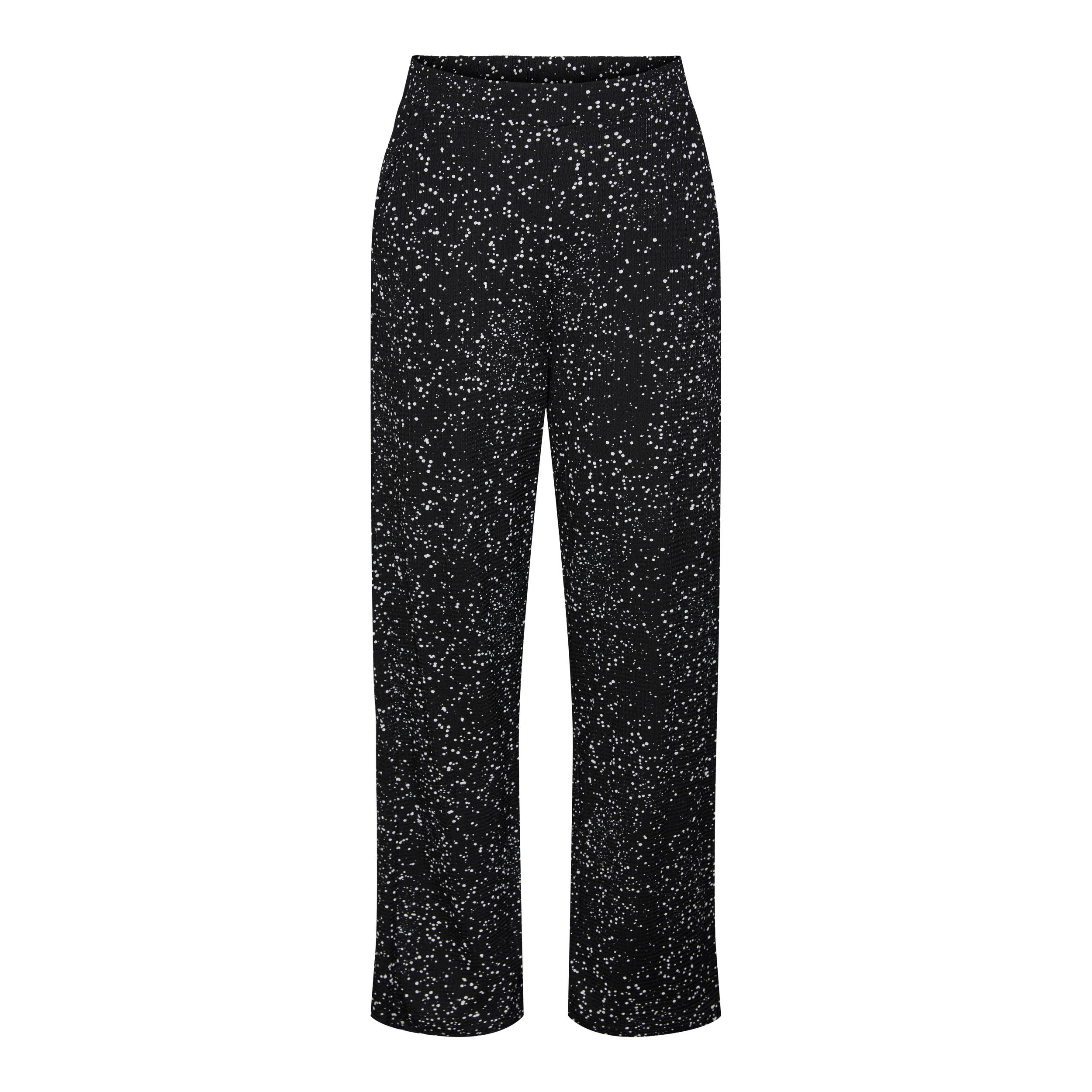 Mooie wijde zwarte broek met witte stippen. De broek heeft een hoge taille en zit heerlijk. Leuk om te combineren met de bijpassende top.
