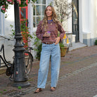 Deze leuke top heeft een dynamisch patroon van horizontale strepen in een warm kleurenpalet van roestbruin, marineblauw, zwart en wit, afgewerkt met een effen kobaltblauwe bies bij de ronde hals.