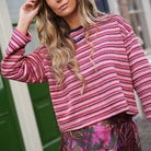 Deze opvallende gestreepte top (kiki streep top fuchsia) is de perfecte, kleurrijke toevoeging aan elke casual outfit. De top heeft een dynamisch patroon van horizontale strepen in tinten van fuchsia, donkerrood en wit, afgewerkt met een donkerblauwe (navy) bies bij de ronde hals.