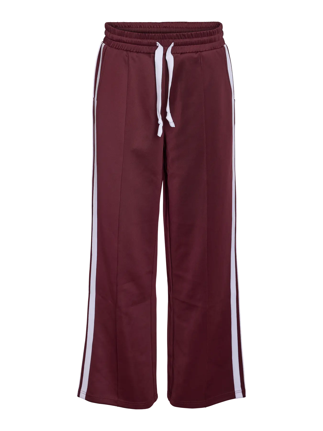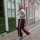 Voeg een sportieve en comfortabele flair toe aan je garderobe met onze 'Jenna Sporty Jogger'. Deze broek in de kleur burgundy combineert stijl met ultiem draagcomfort dankzij de elastische tailleband met trekkoord en de zachte stof. De klassieke witte streep aan de zijkant zorgt voor een dynamische en retro-geïnspireerde look. Ideaal voor een relaxte dag of een trendy casual outfit.