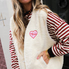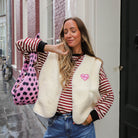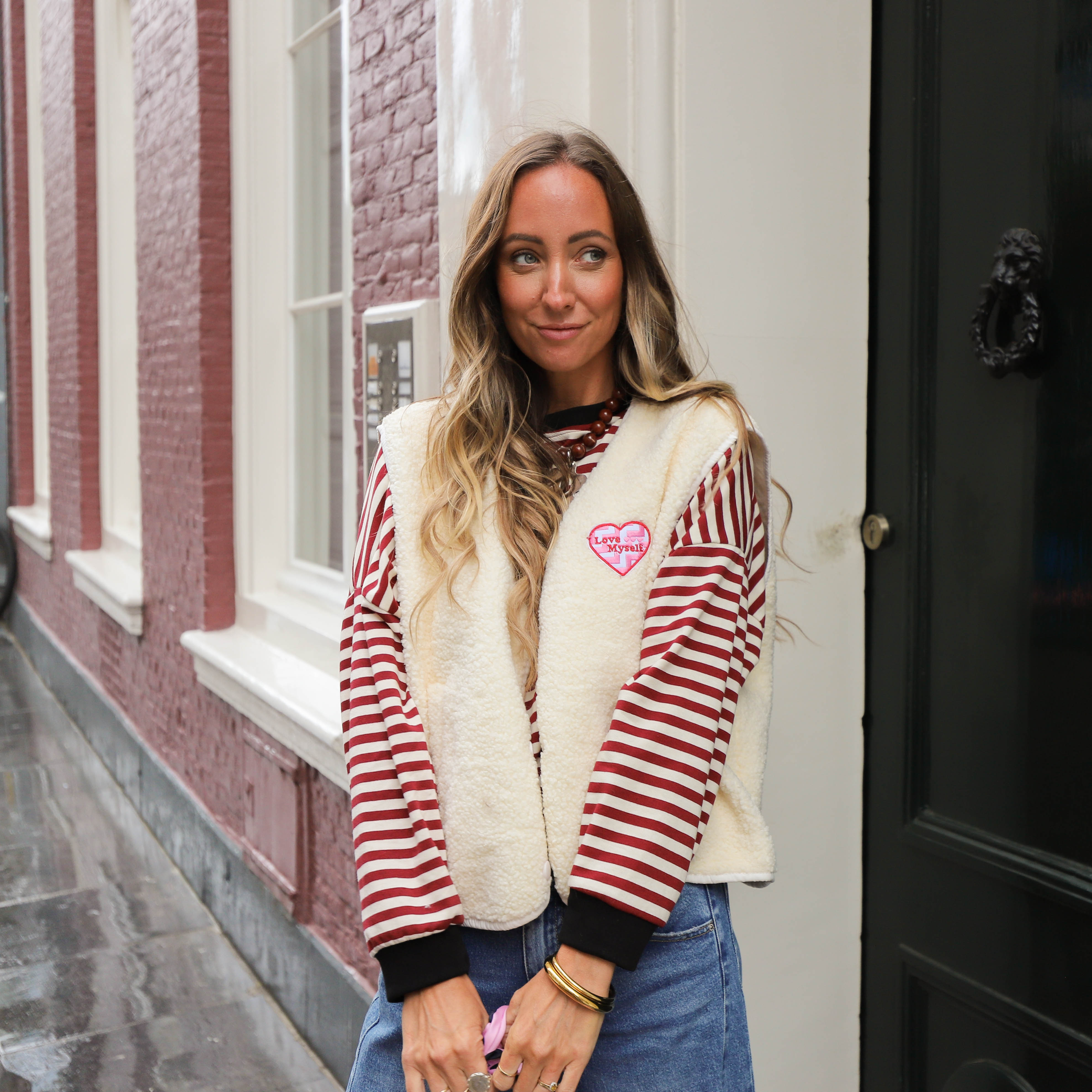 Geef je outfit een comfortabele en trendy twist met dit heerlijke ecru teddy gilet. Dit gilet heeft een korte, mouwloze pasvorm en is gemaakt van een superzachte teddy stof. Het gilet sluit met knoopjes aan de voorkant en is voorzien van een schattige patch in de vorm van een hart met de tekst 'Love yourself' op de borst.