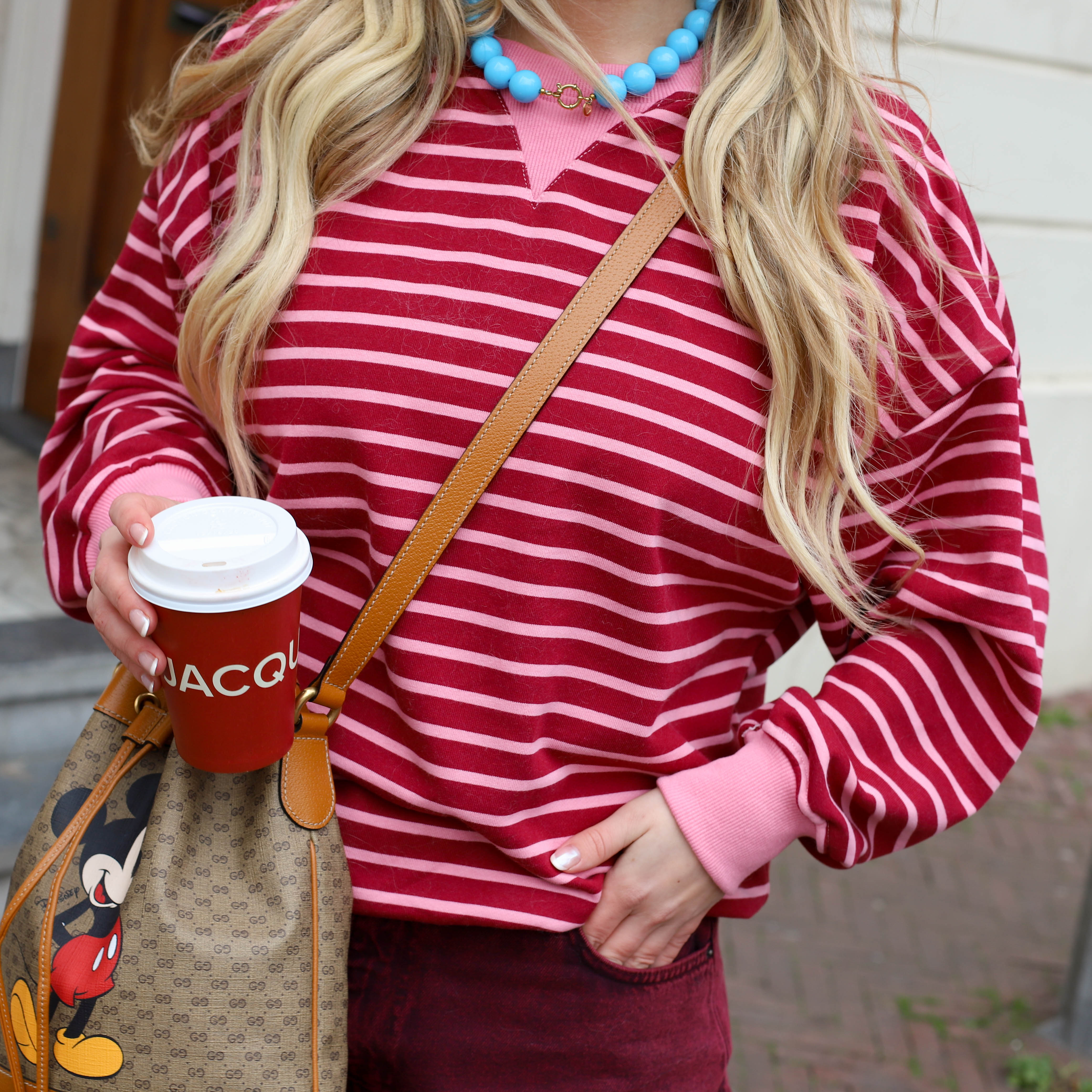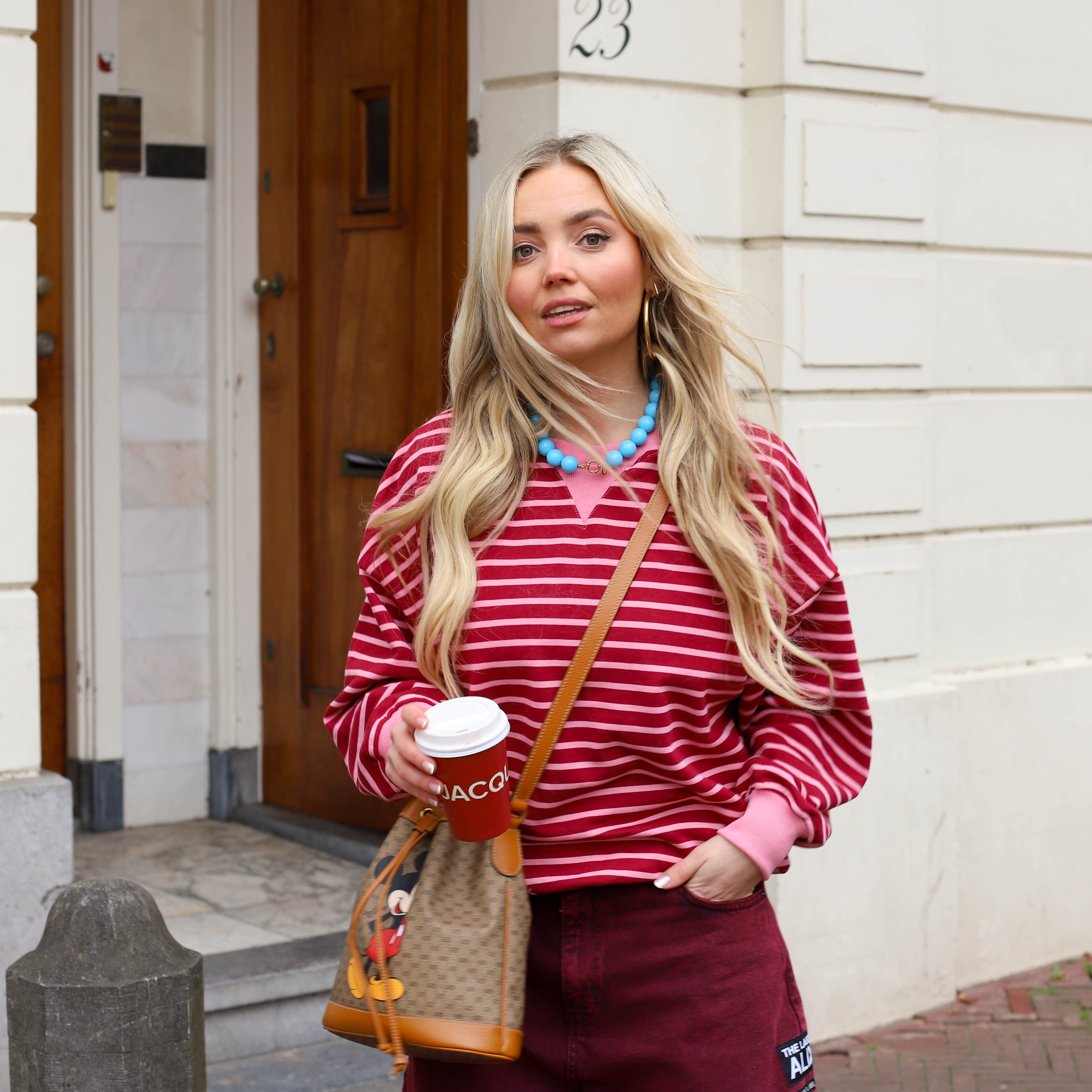 Deze zachte sweater met een opvallend gestreept patroon in verschillende roze tinten is een comfortabele en stijlvolle toevoeging aan je garderobe. De trui heeft een klassieke ronde hals en boorden aan de mouwen en onderkant. De ruime pasvorm en de langere lengte maken dit een perfecte trui voor een casual en relaxte look.