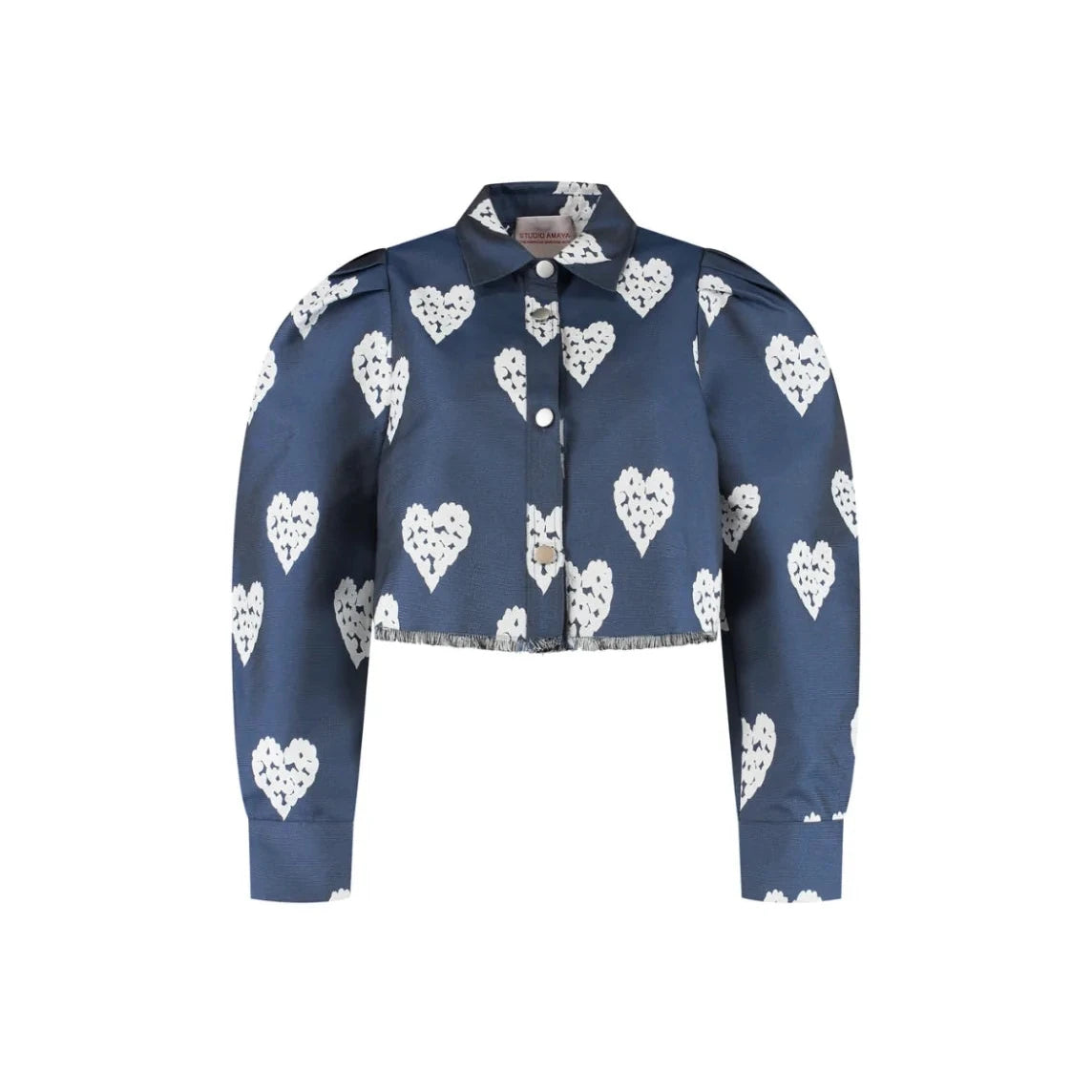 Dit charmante Heart Blue Jeans Jacket van Studio Amaya is een echte blikvanger. Het cropped model is uitgevoerd in een blauwe denim-look en is bedrukt met speelse witte hartjes. De pofmouwen en de raw-edge zoom geven het jasje een trendy en unieke uitstraling. Perfect om je outfit een dosis vrolijkheid en liefde mee te geven!
