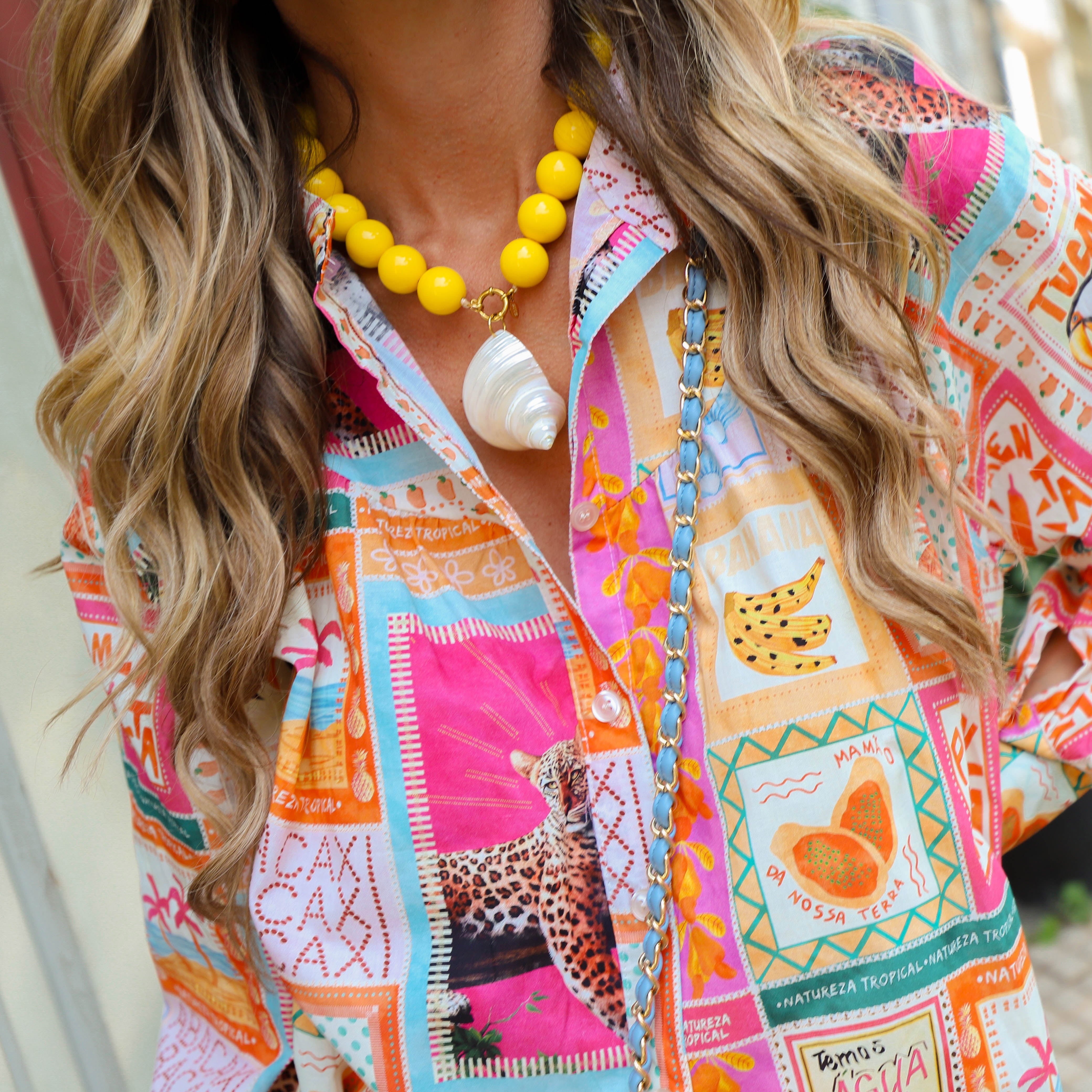 Deze opvallende blouse is een kleurrijke en vrolijke toevoeging aan je garderobe. De blouse heeft een all-over print met diverse tropische elementen, waaronder ananassen, toekans, luipaardprints en schelpen, in een palet van roze, oranje, geel en blauw. De staande kraag en lange mouwen maken de look compleet.
