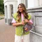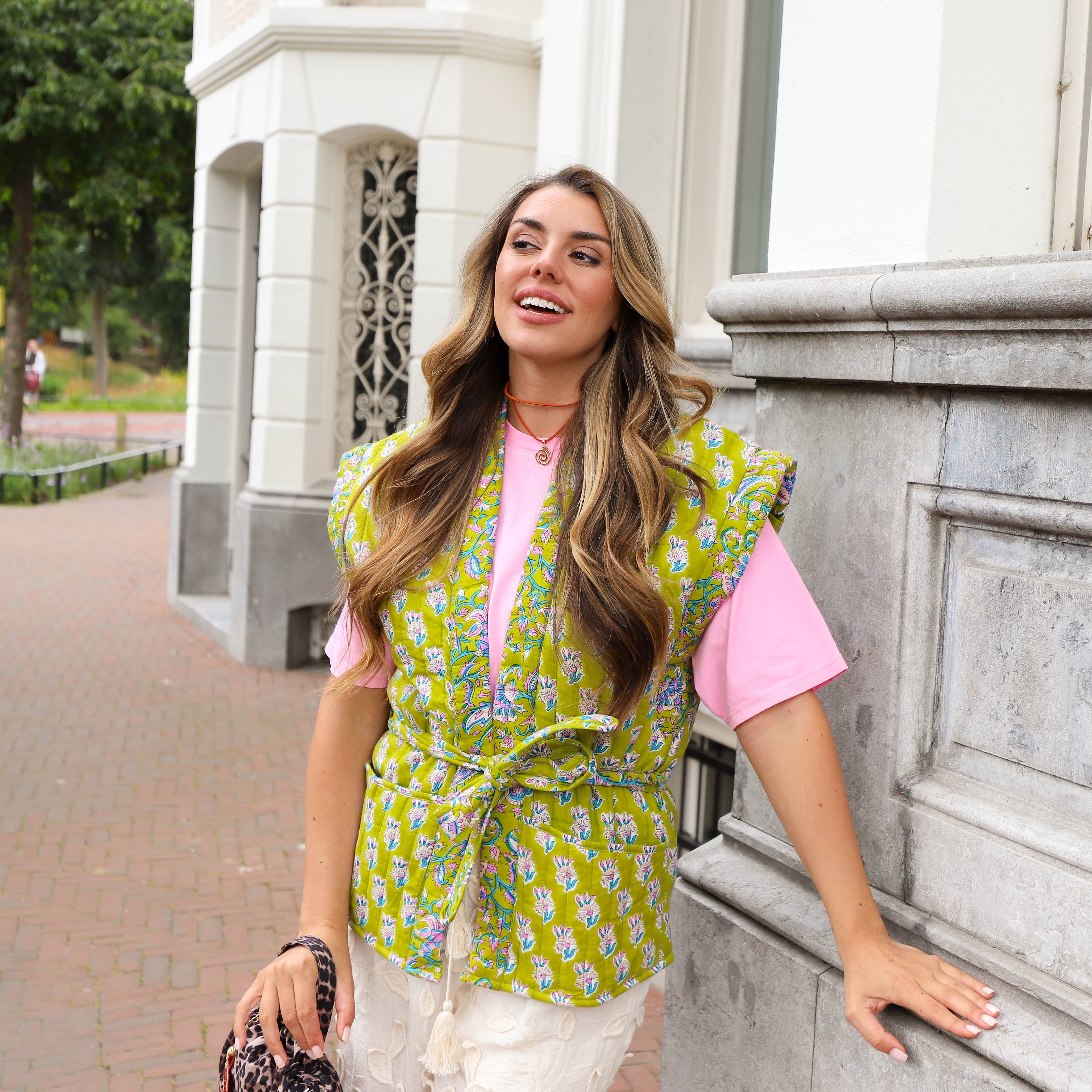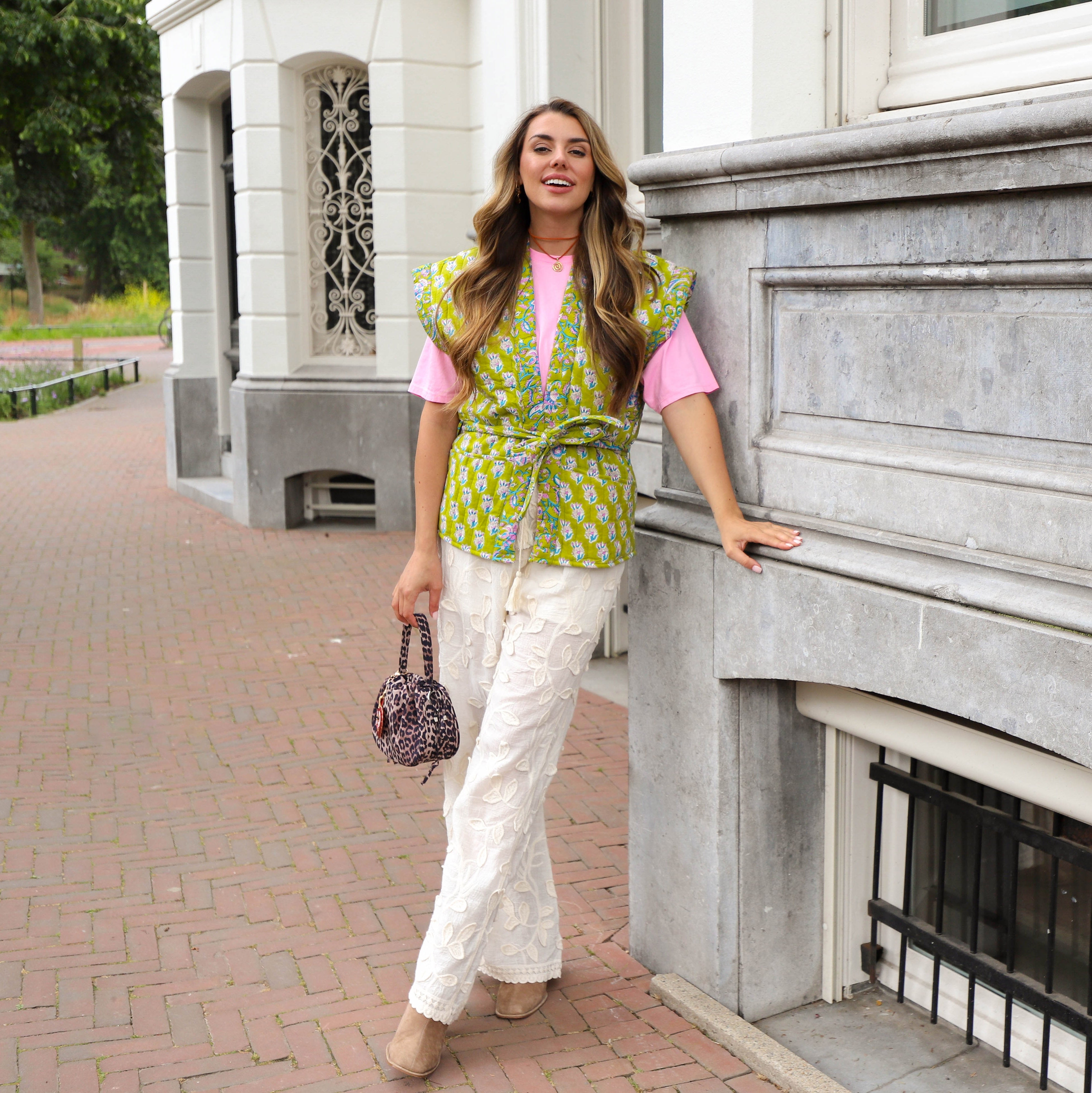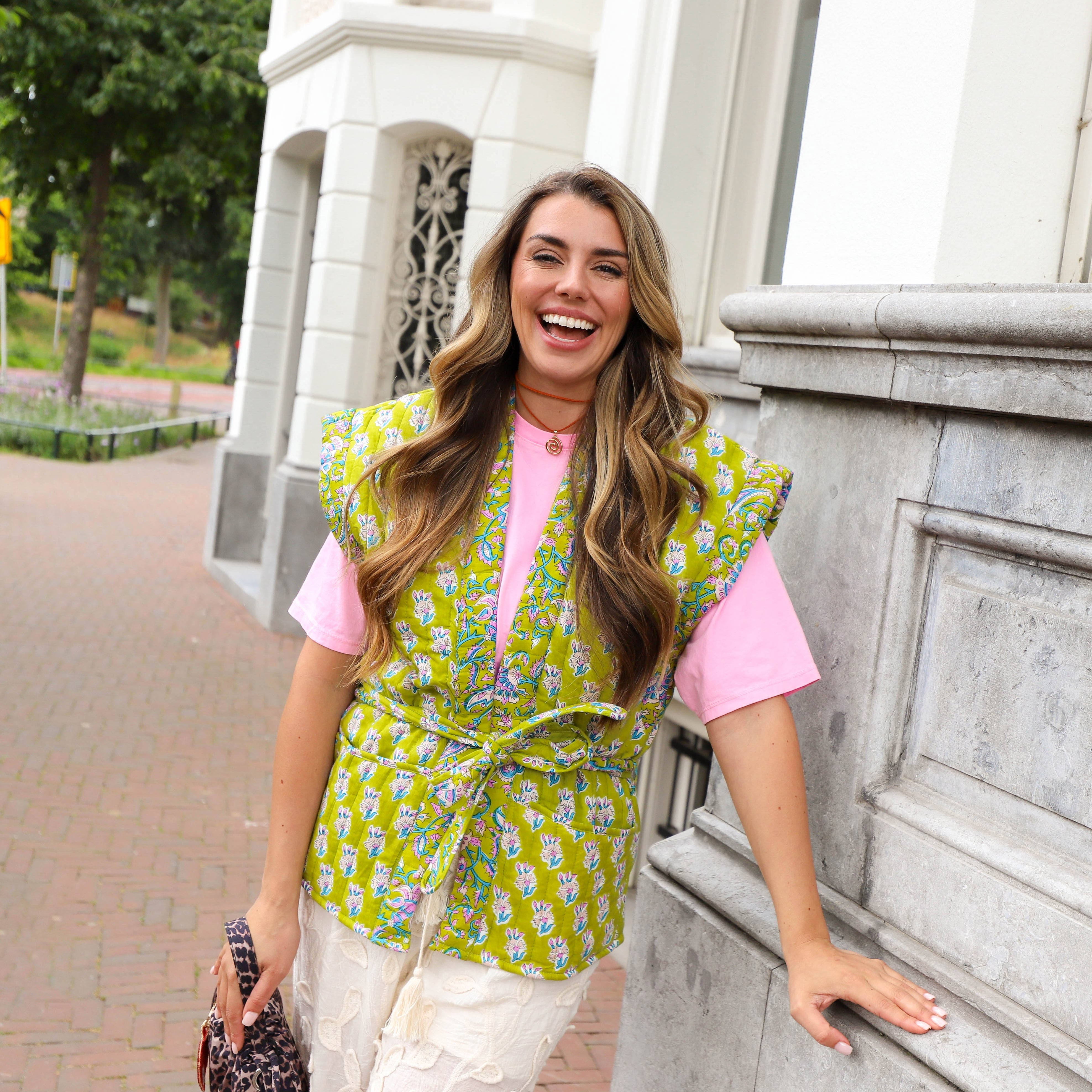 Dit vrolijke gilet is uitgevoerd in een warme olijfgroene tint en voorzien van een prachtige all-over print van kleine, gedetailleerde bloemmotieven in wit en lichtblauw, afgewisseld met grotere paisley-achtige accenten in blauw en paars. Leuk met een shirtje en een broek!